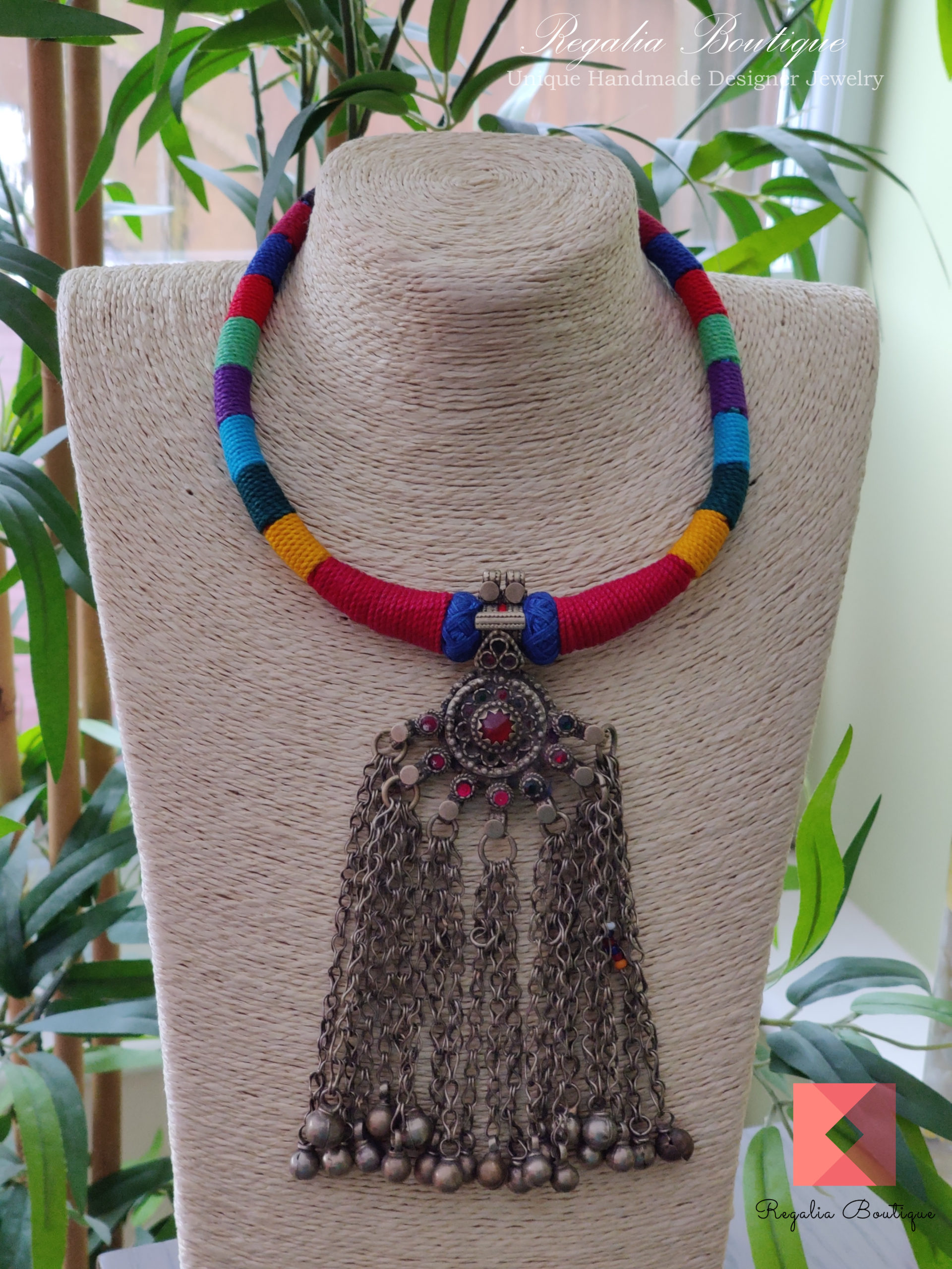 Express your energy with this bright-coloured vibrant hand-crafted thread necklace ornamented with rustic antique finish Afghan pendant. This electric style lets you stand out from the crowd.