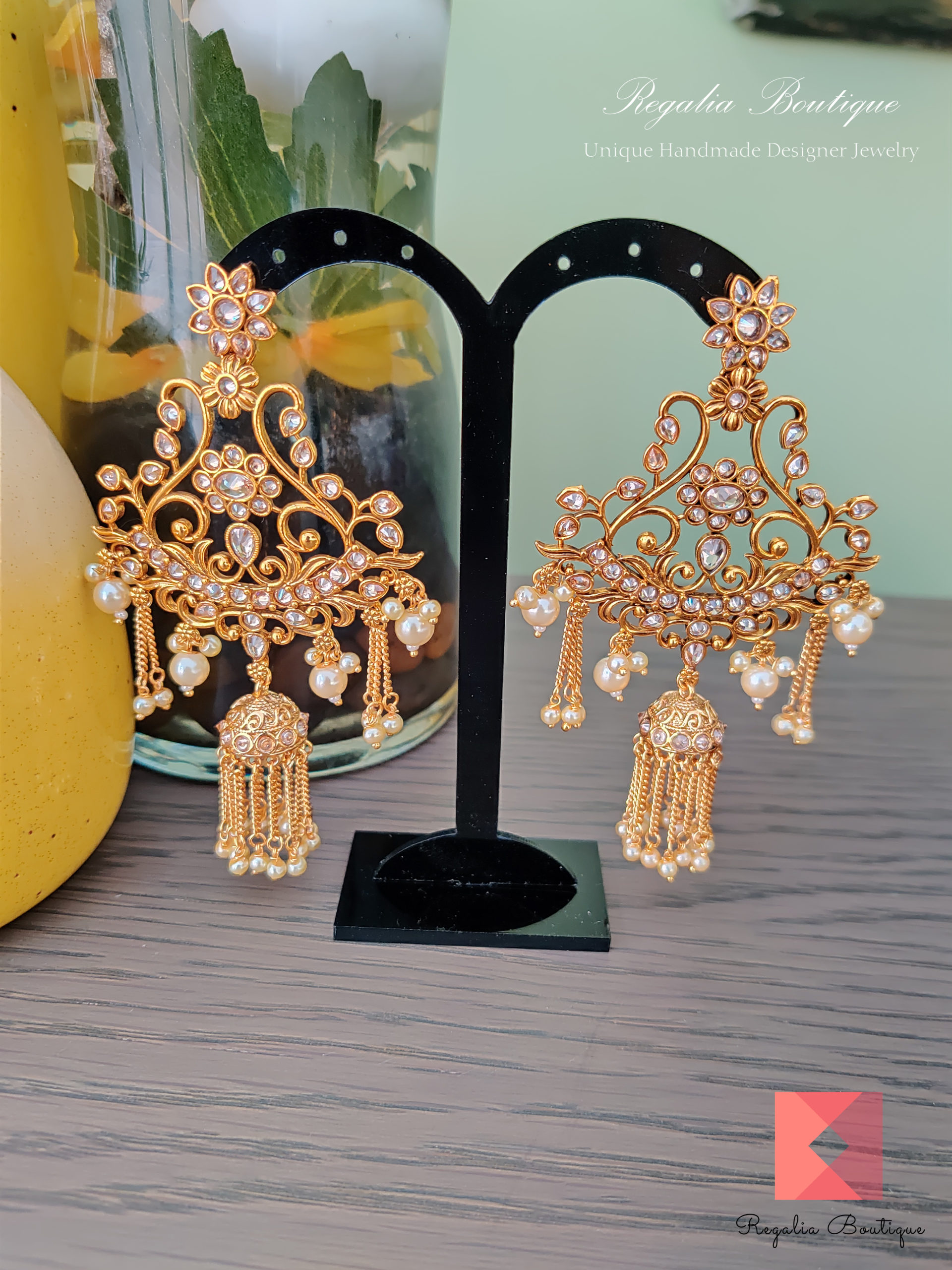 Antique 18 carat gold plated long chandelier jhumka earrings embellished with kundans and pearls.
