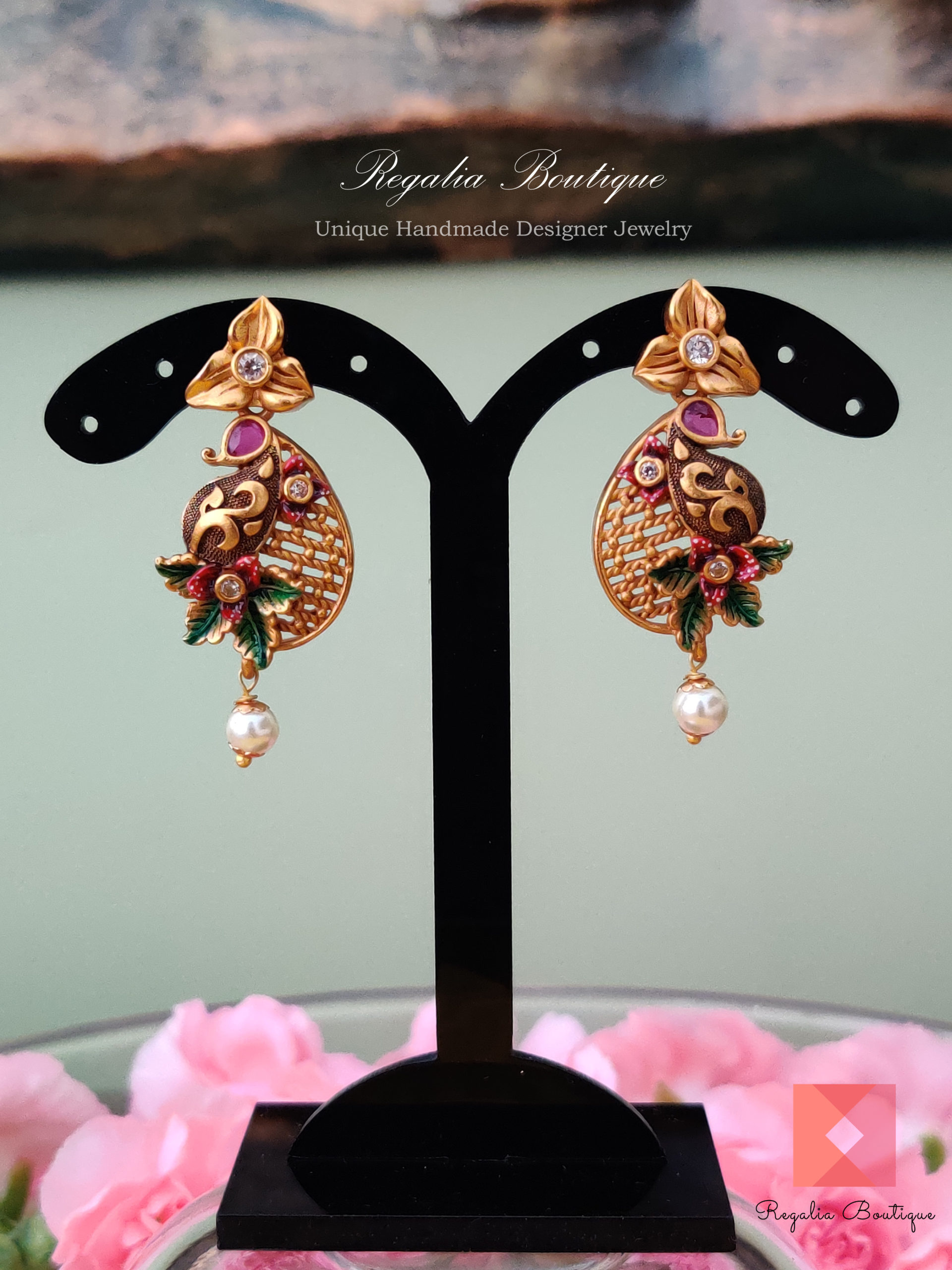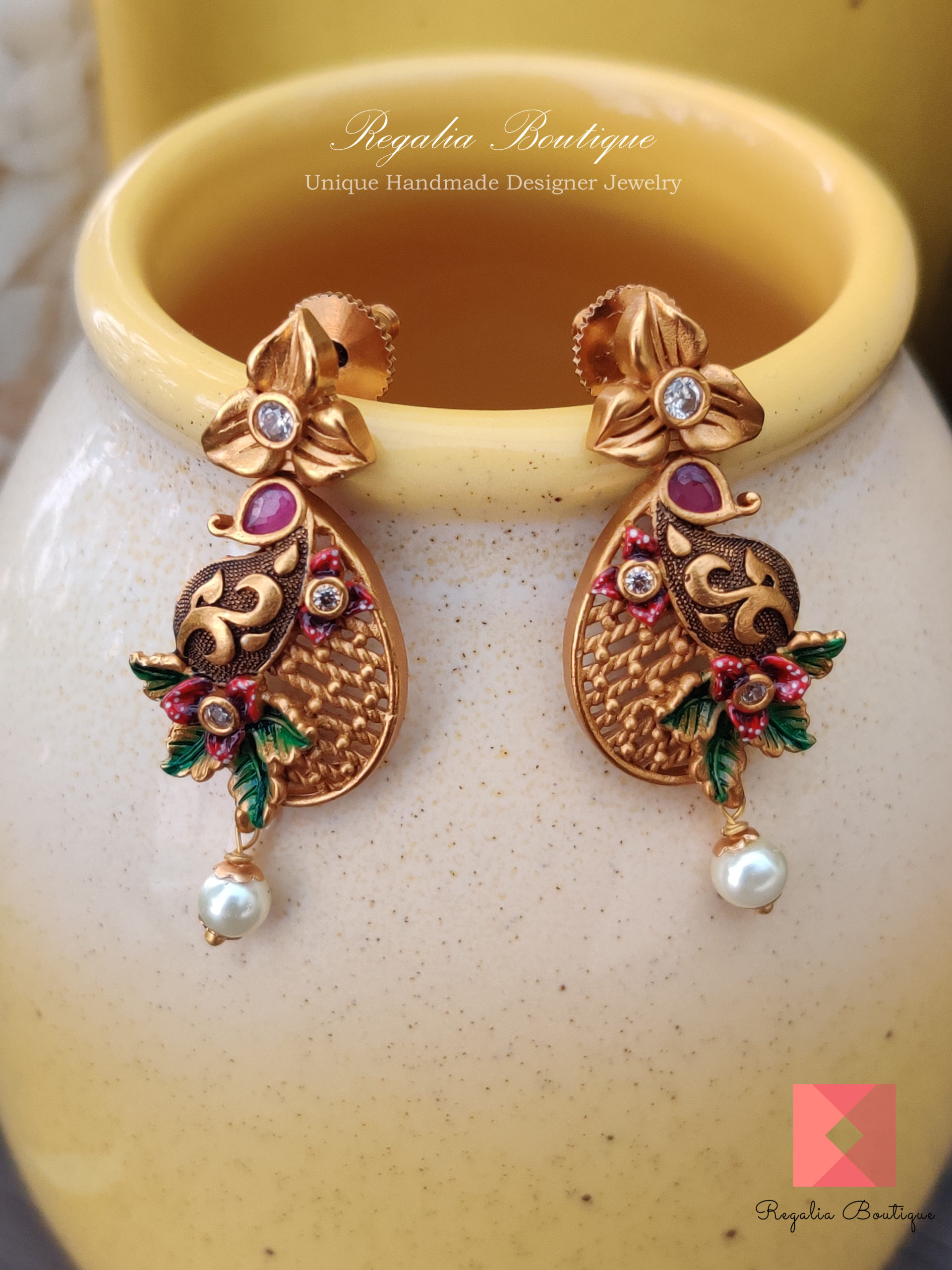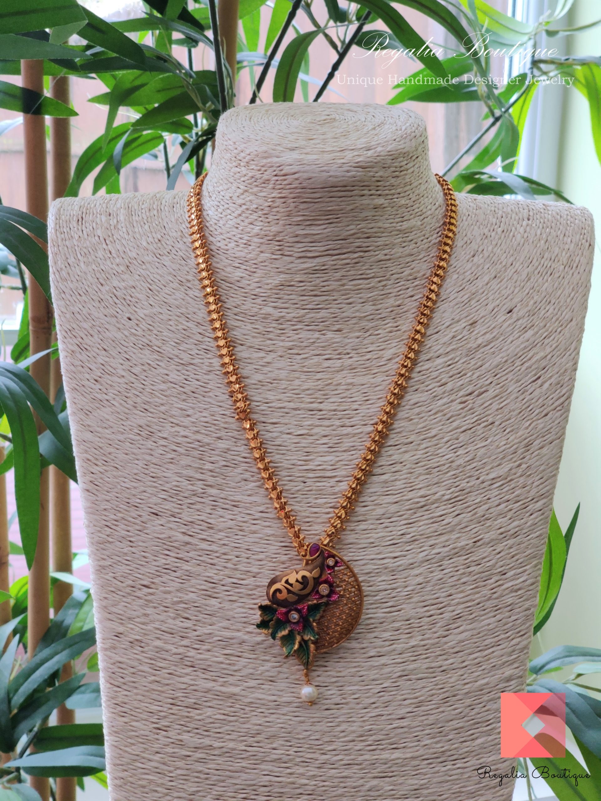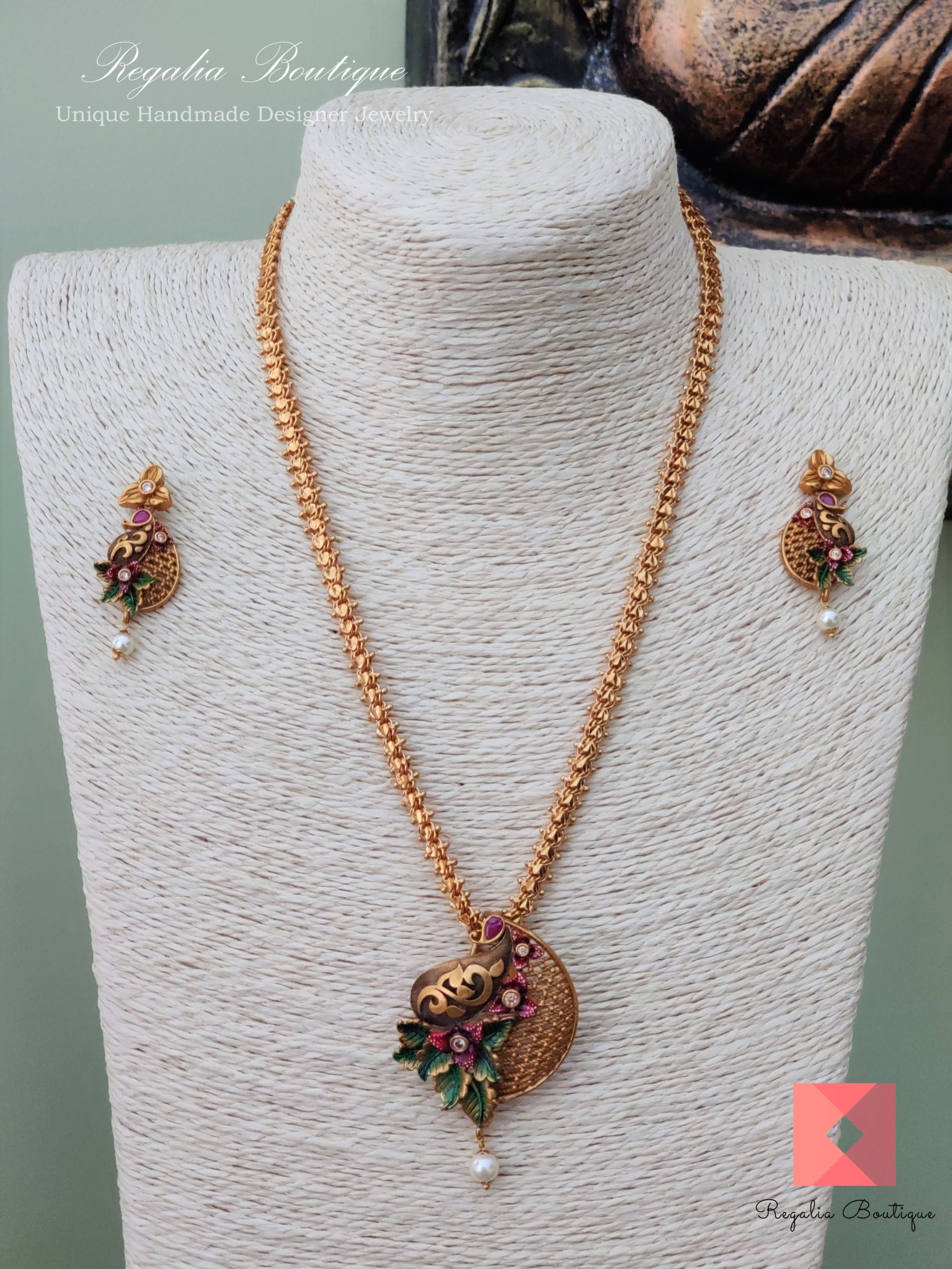 This simple, elegant and modern necklace set is designed in 1 gram gold plated finish with intricate workmanship, portraying hand-painted art work and high-quality studded stones. It’s sure to complement your looks and stand out from the crowd.