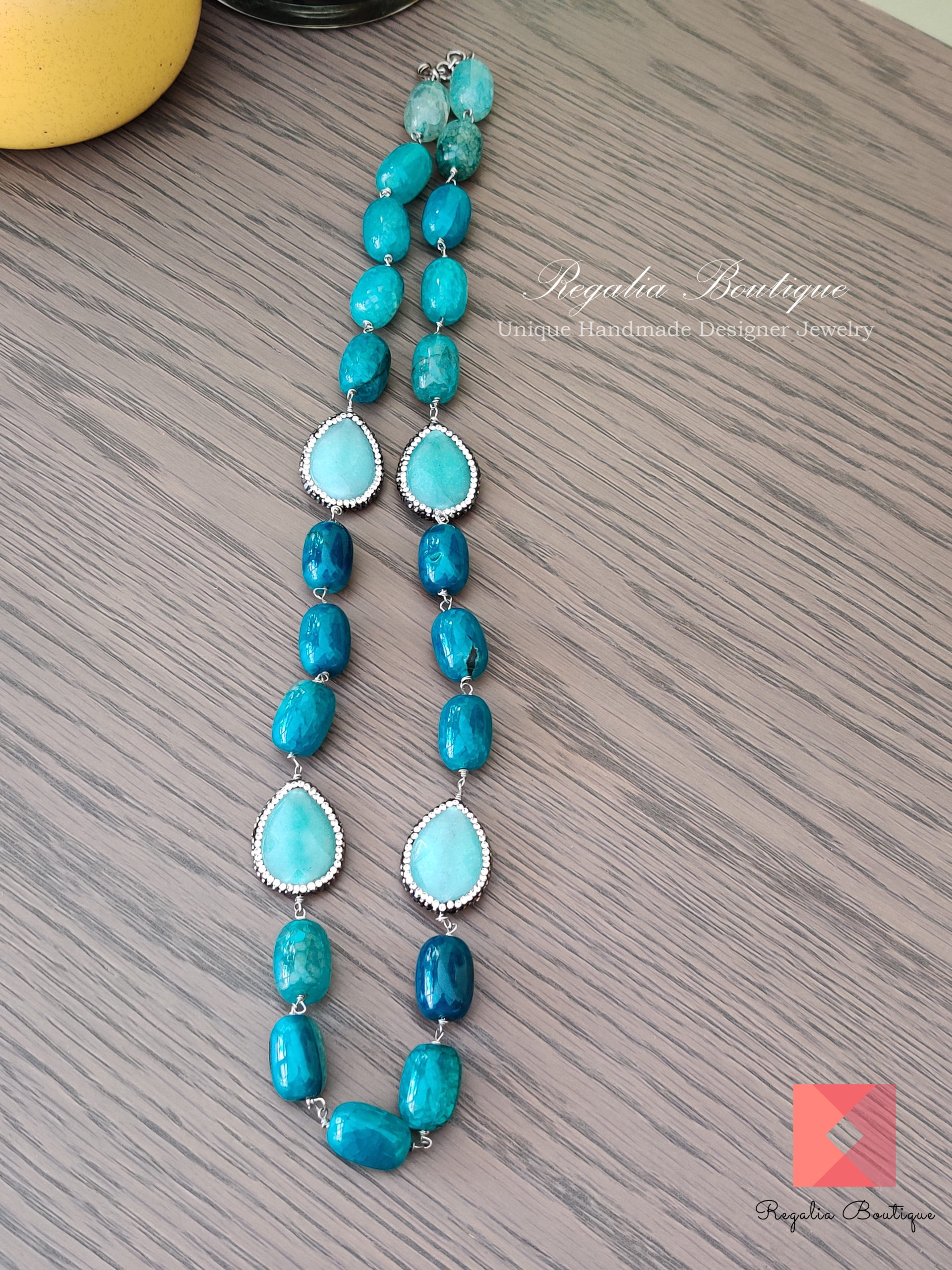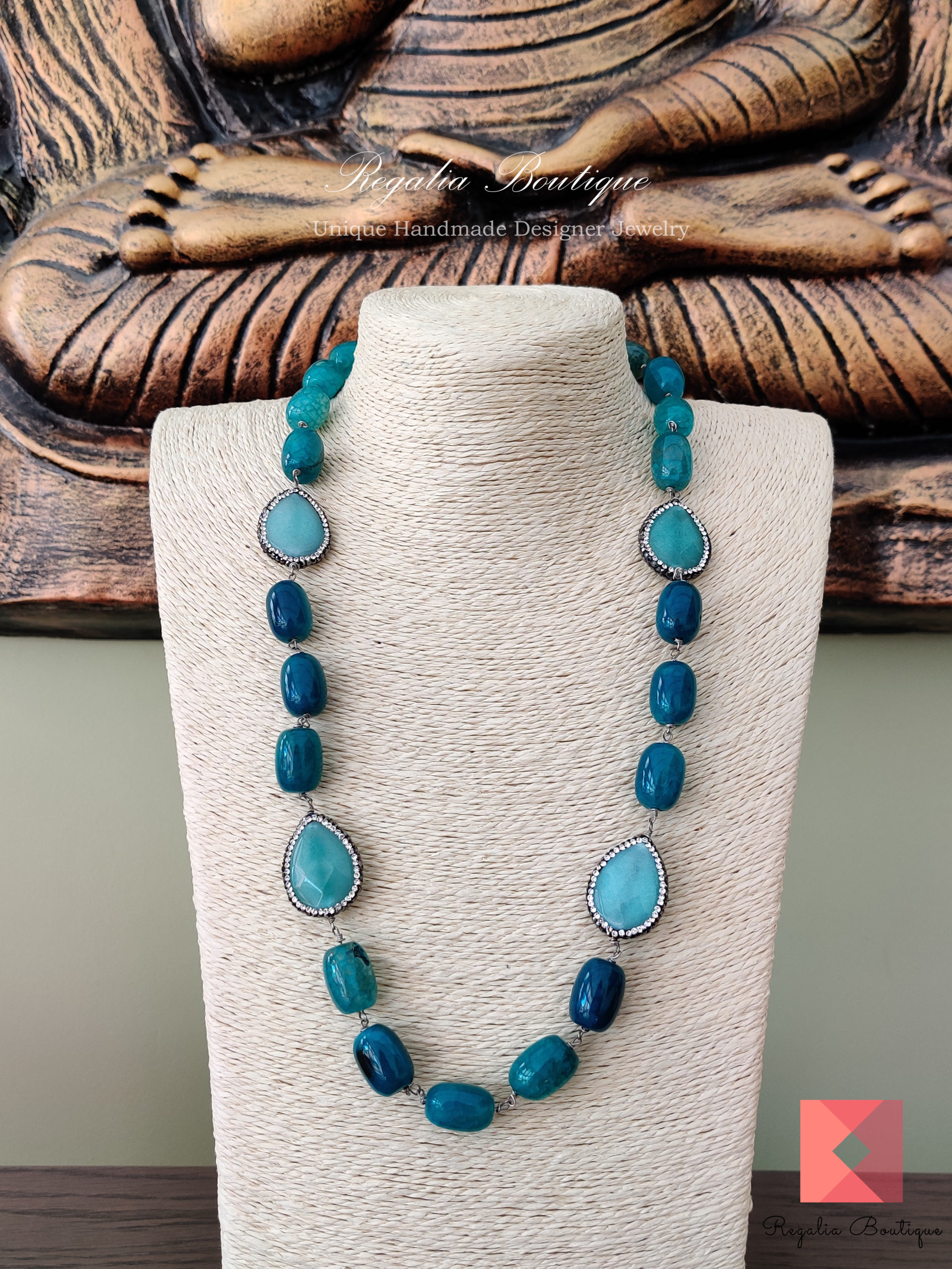 This icy blue dew drop designer necklace is stunningly hand-crafted with semi-precious and american diamond edged beads making the wearer feel so soulful and attractive.