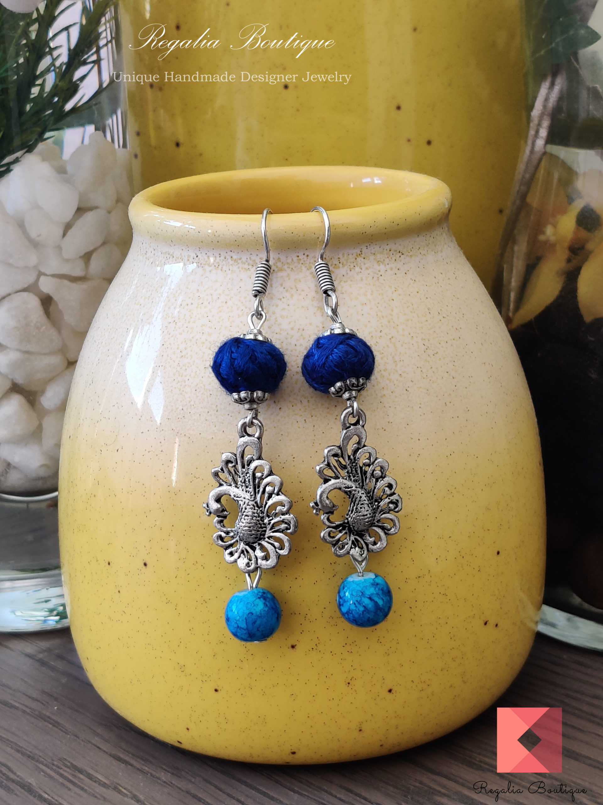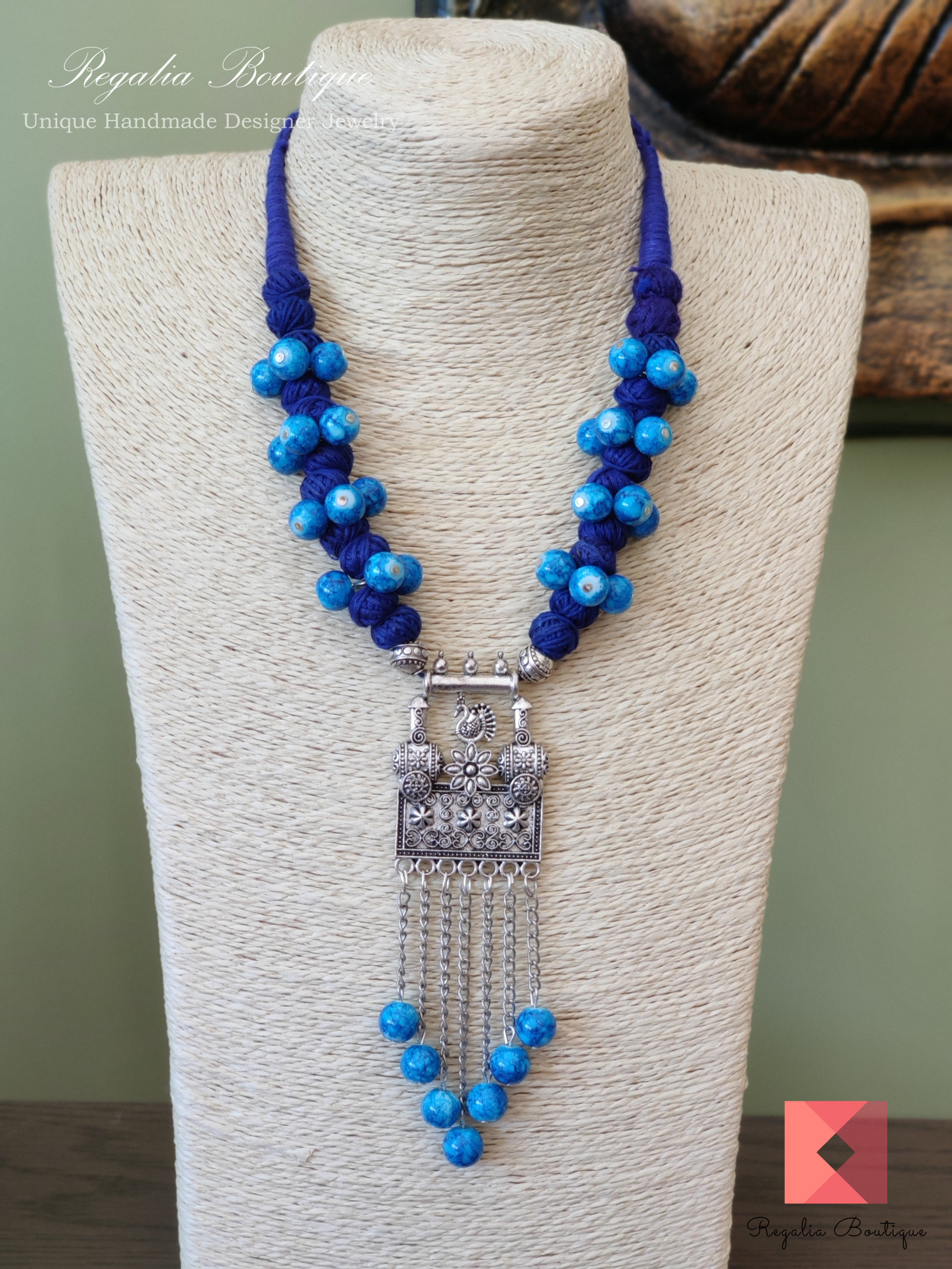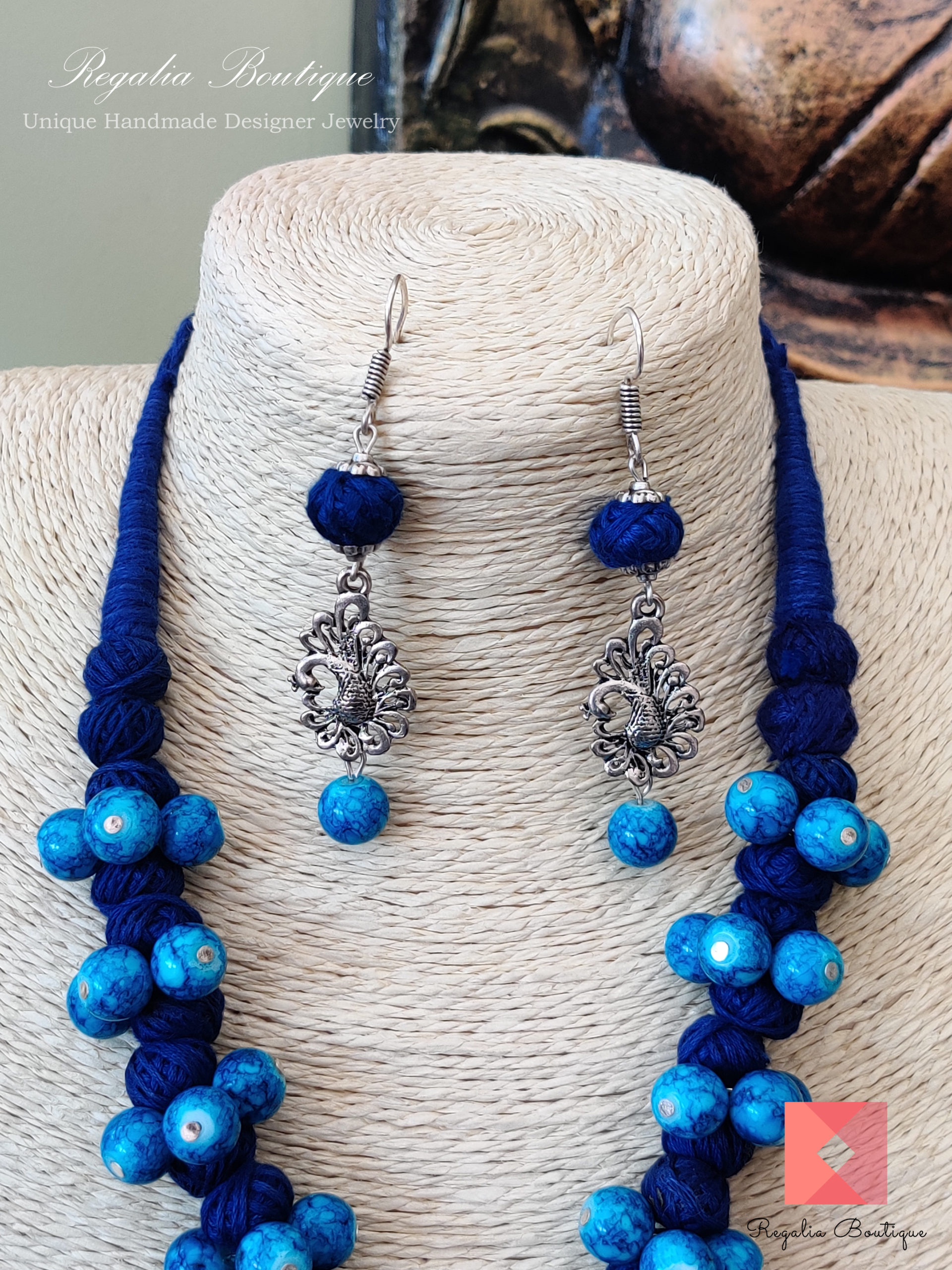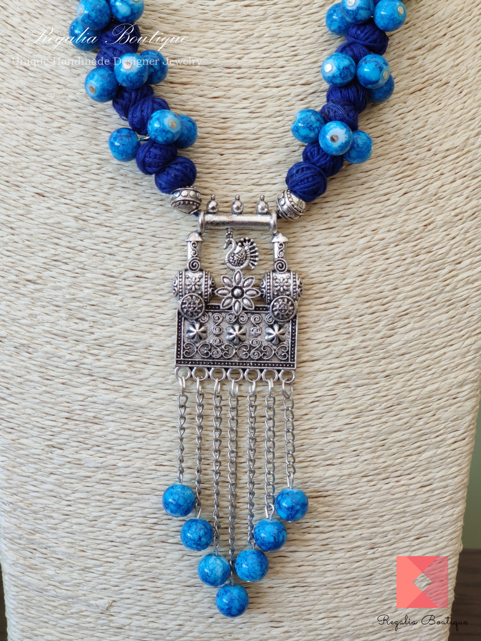 Blue Shade Thread Necklace Set with German Silver Stylish Pendant. Earrings Included.