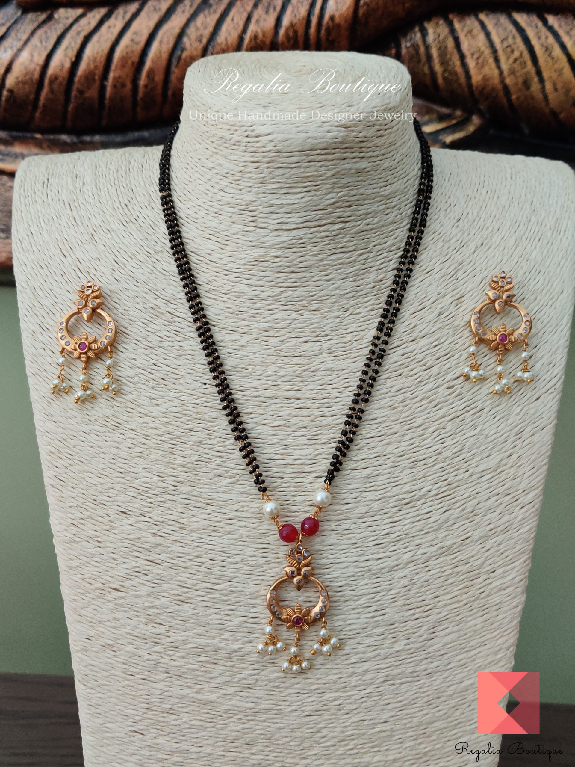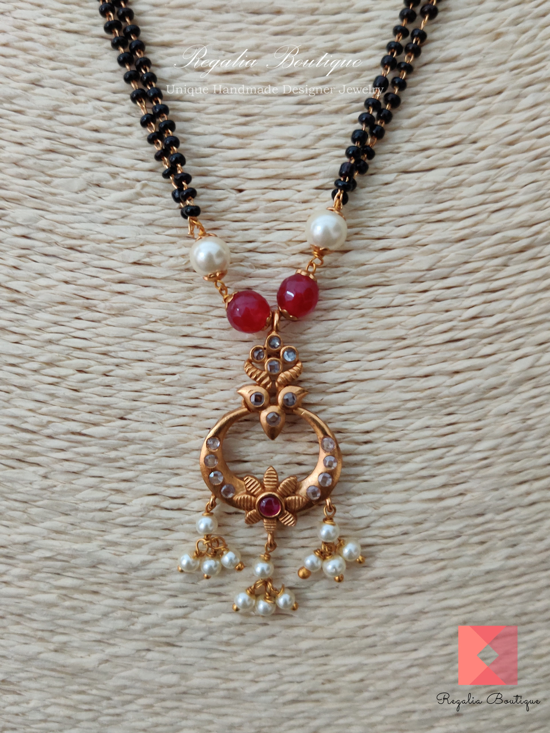 A dual strand traditional and classic mangalsutra necklace set in antique 18 carat gold plated matte finish and embellished with cz stones and pearls.