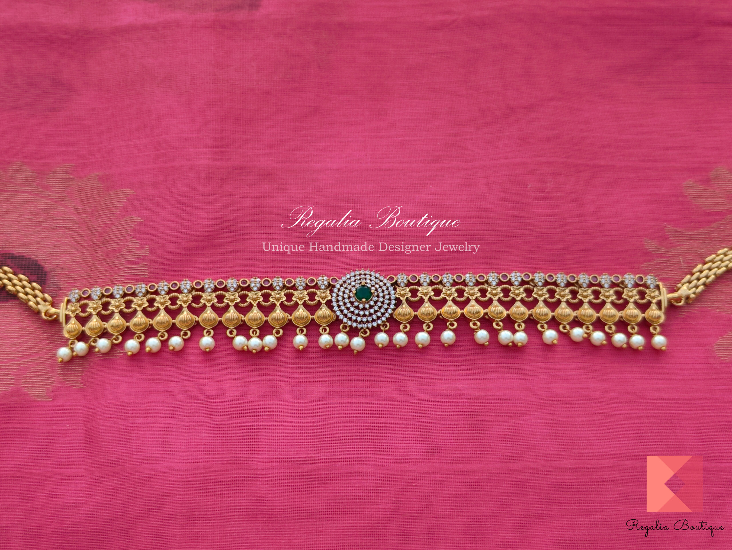Adorn your festival look with this beautiful Dancing Flower Antique Choker Set! Intricately handcrafted by expert artisans, this antique gold-plated CZ stone studded necklace will perfectly match your ethnicity.
