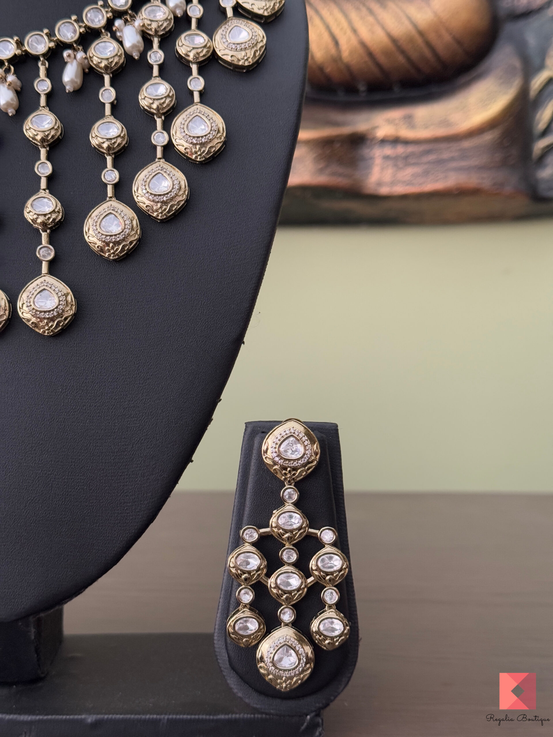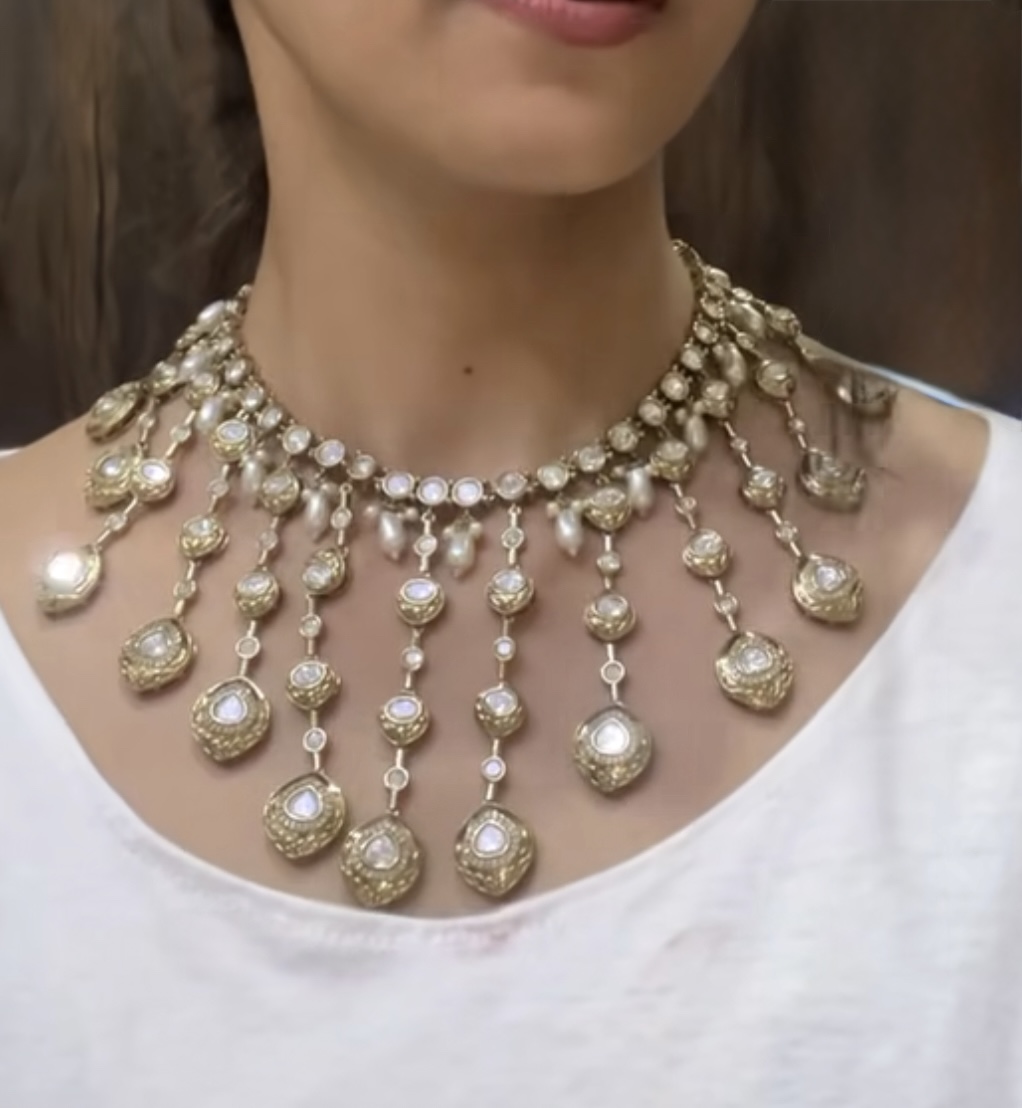 Step into the world of royalty with this breathtaking Exquisite Kundan & Pearl Necklace Set. Meticulously crafted with intricate gold detailing and sparkling kundan stones, adorned with delicate pearl drops adding a touch of grace. Also comes paired with matching chandelier earrings to complete your royal ensemble. This piece radiates luxury & timeless beauty.