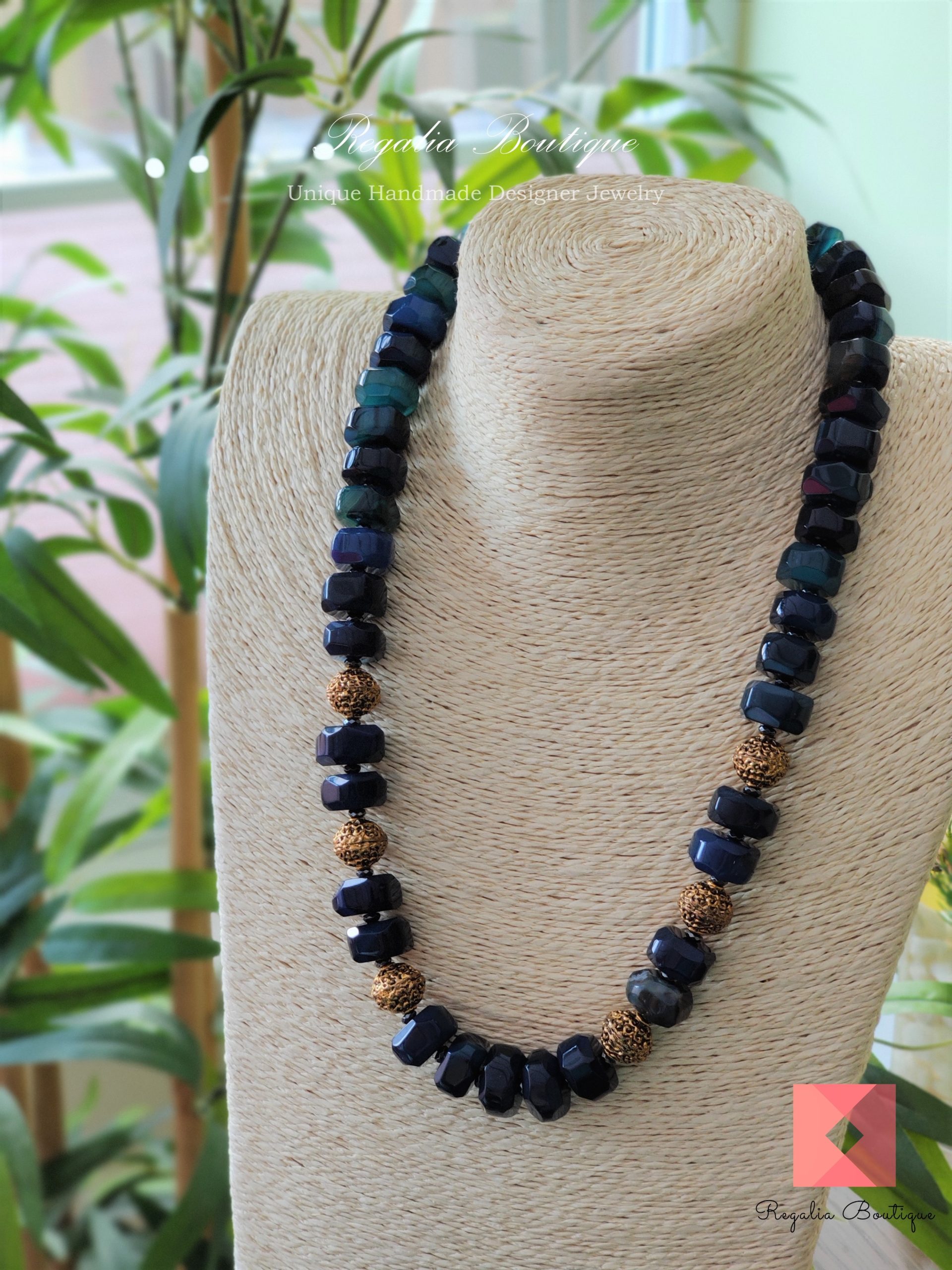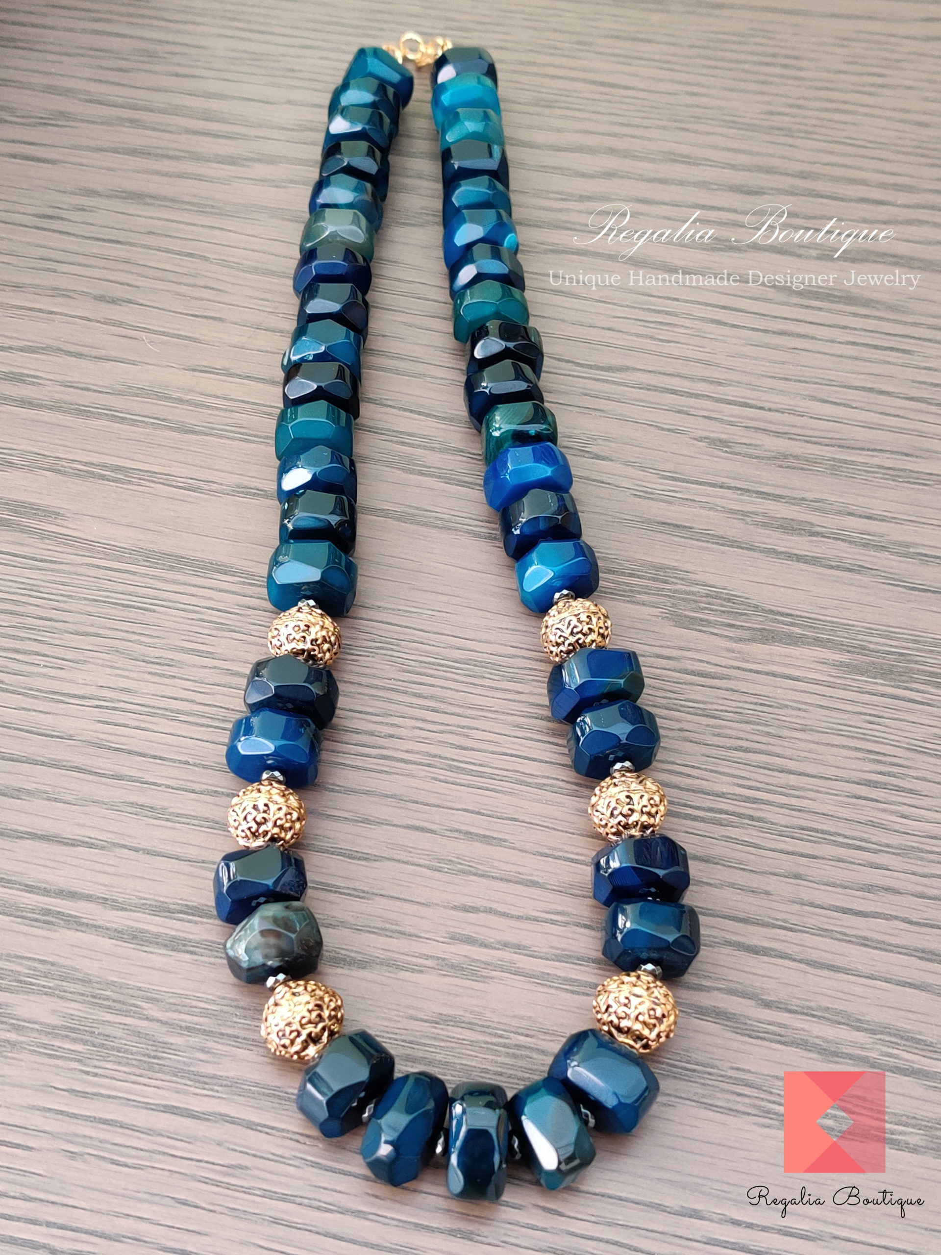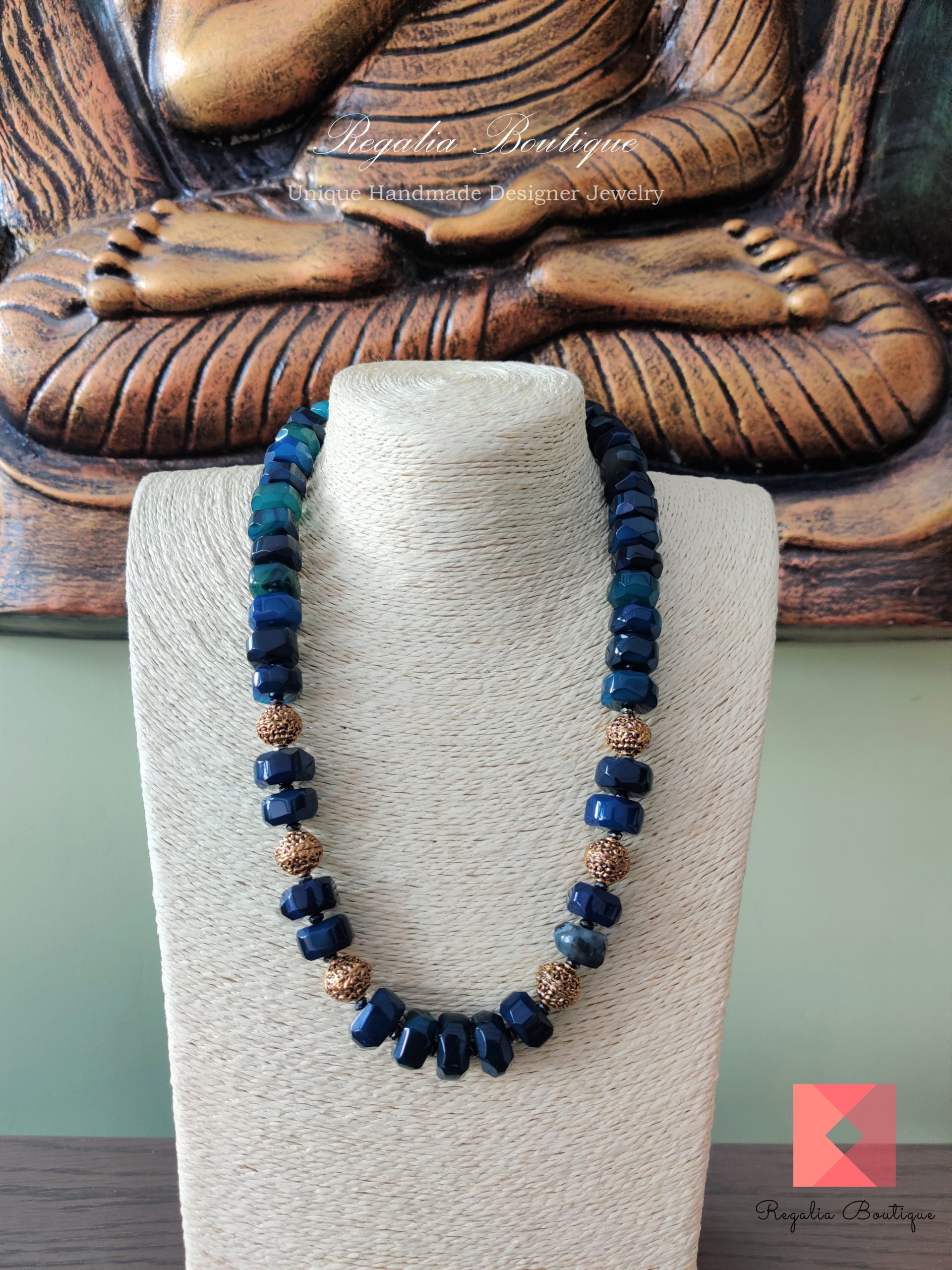 Make a statement with this dark blue designer semi-precious hexagon bead necklace. It’s simply alluring and yet carefully hand-crafted, ornamented with antique charms to bring in the royal statement look. You’ll sure fall in love at first sight.