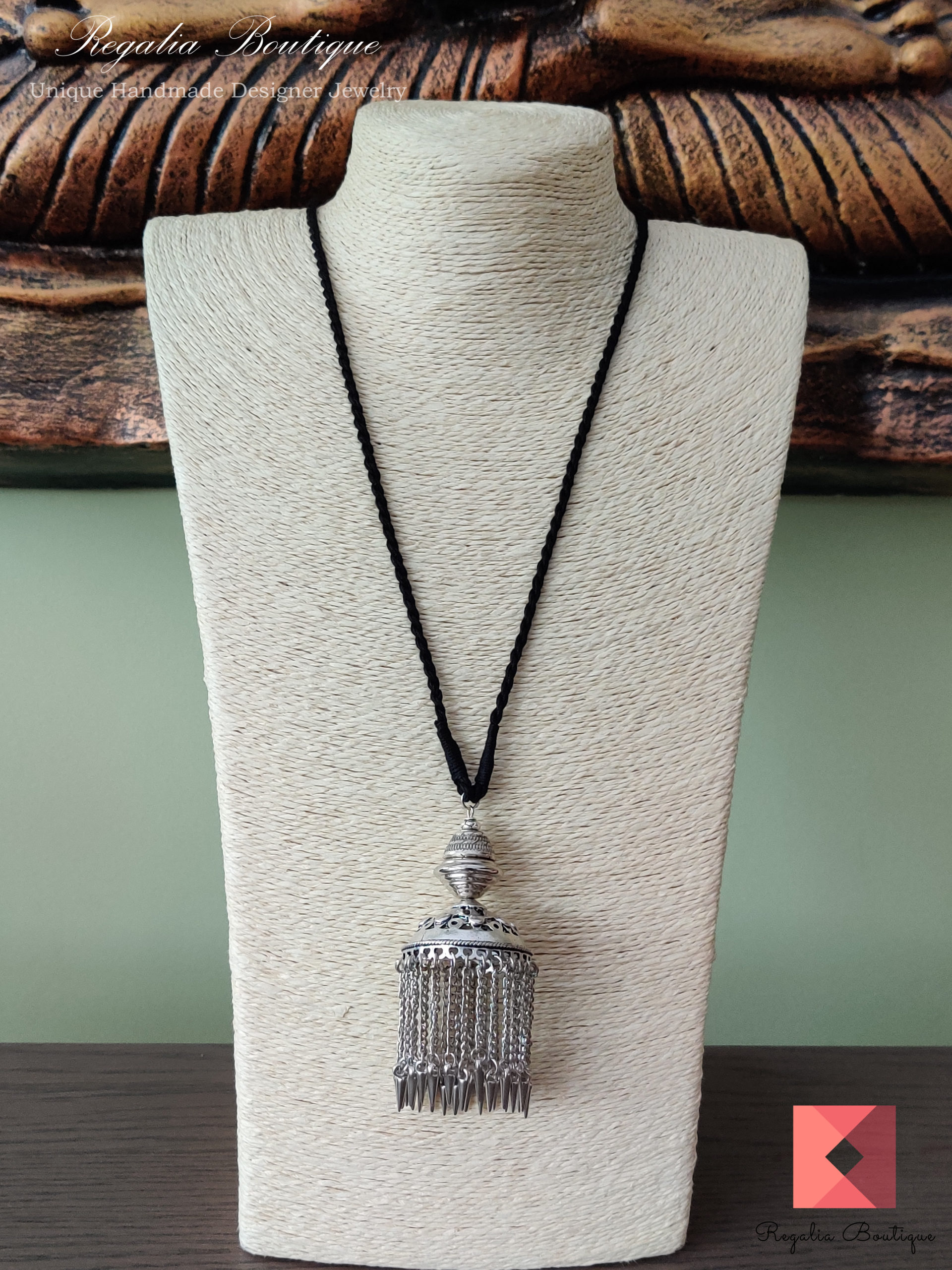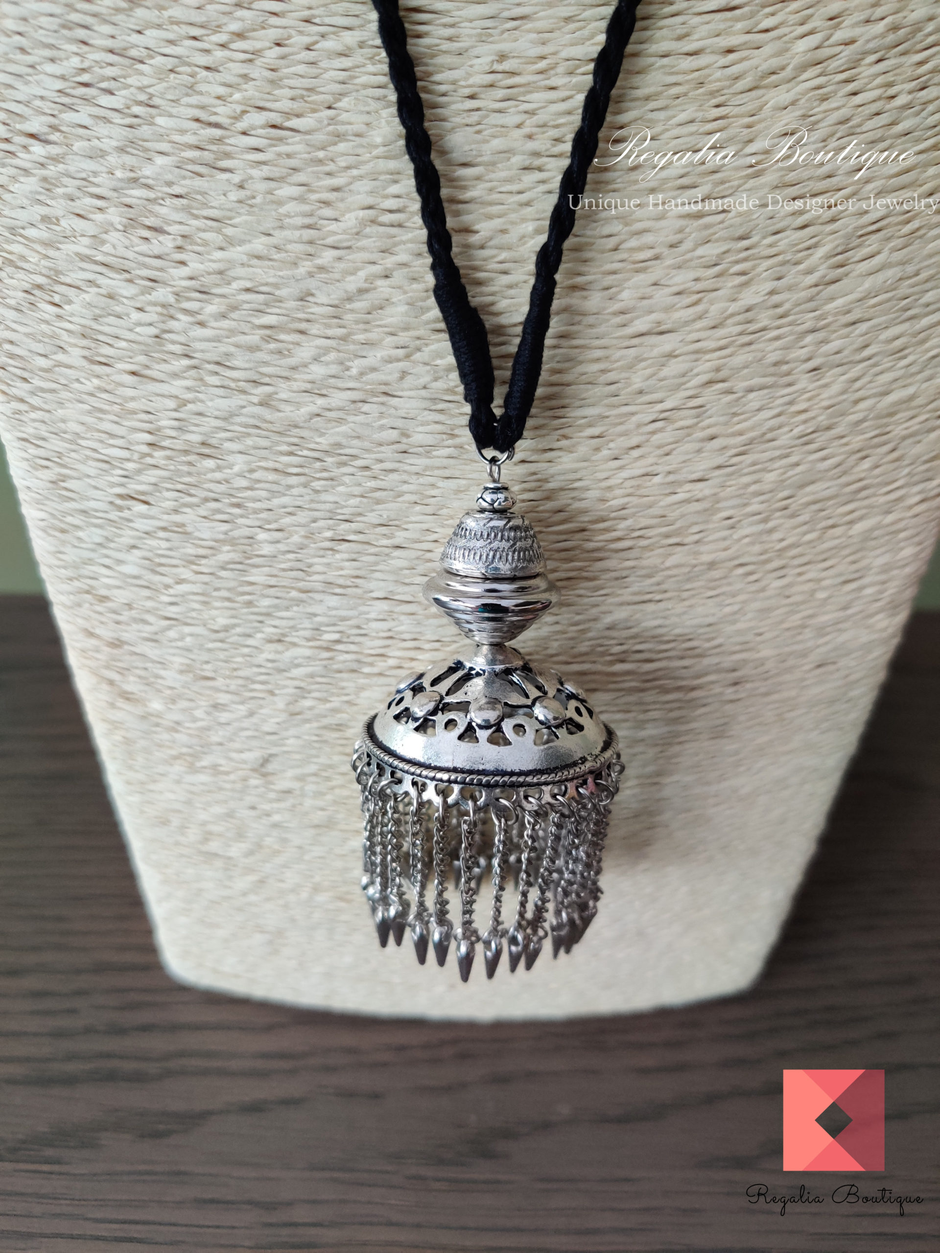 A very trendy and cute jumbo jhumka pendant on a contrast string of rope, making it a total style maker.