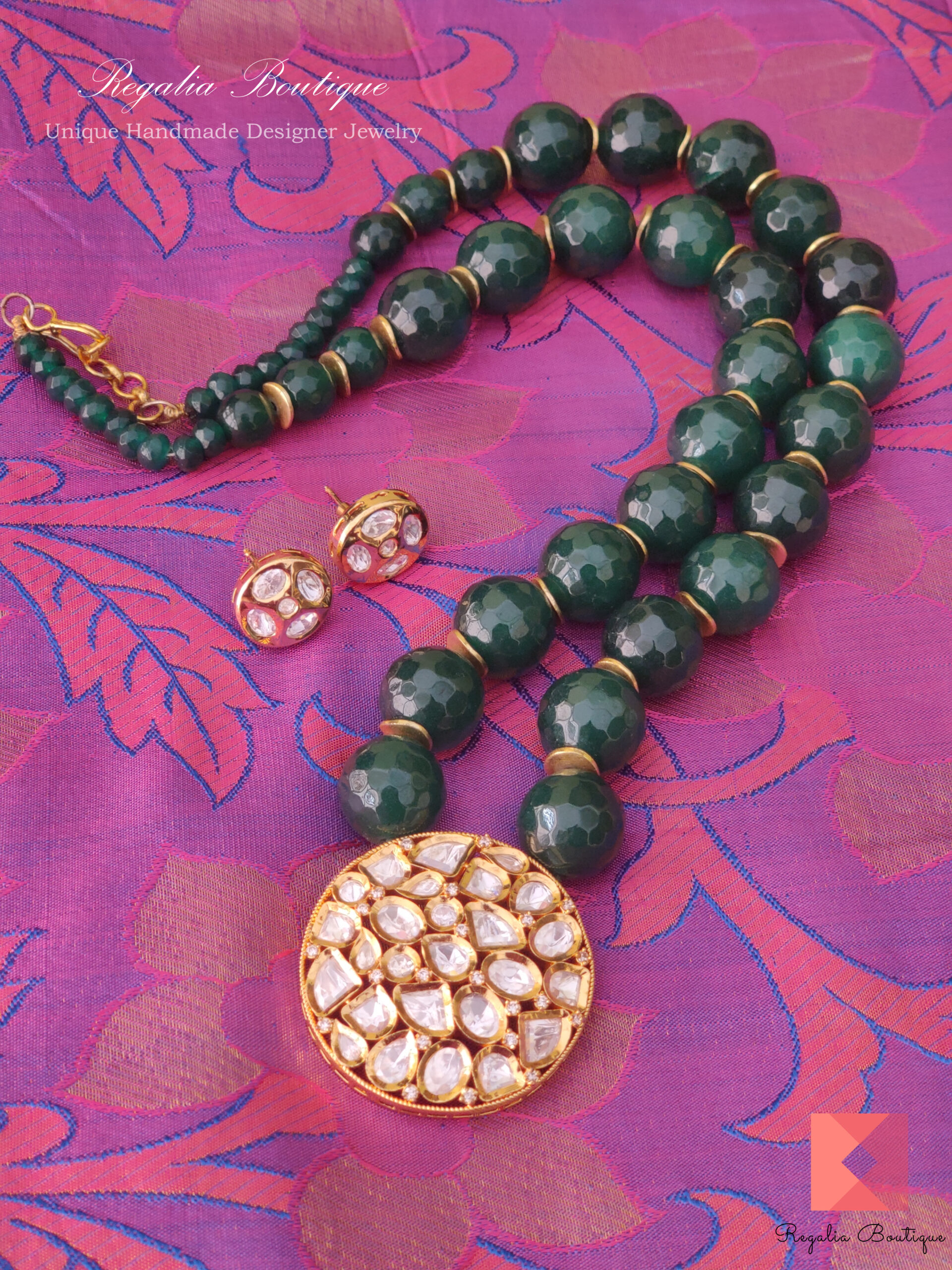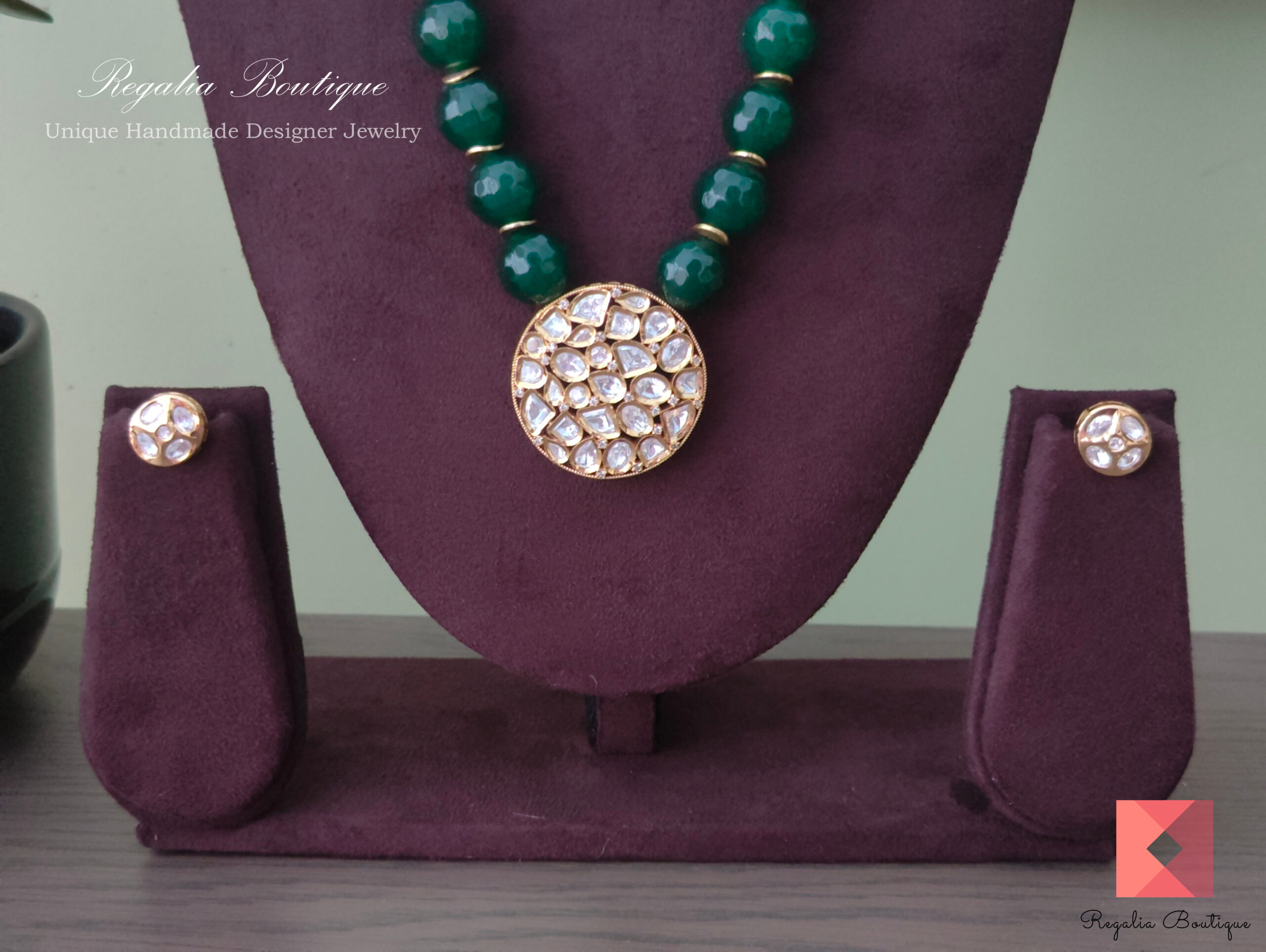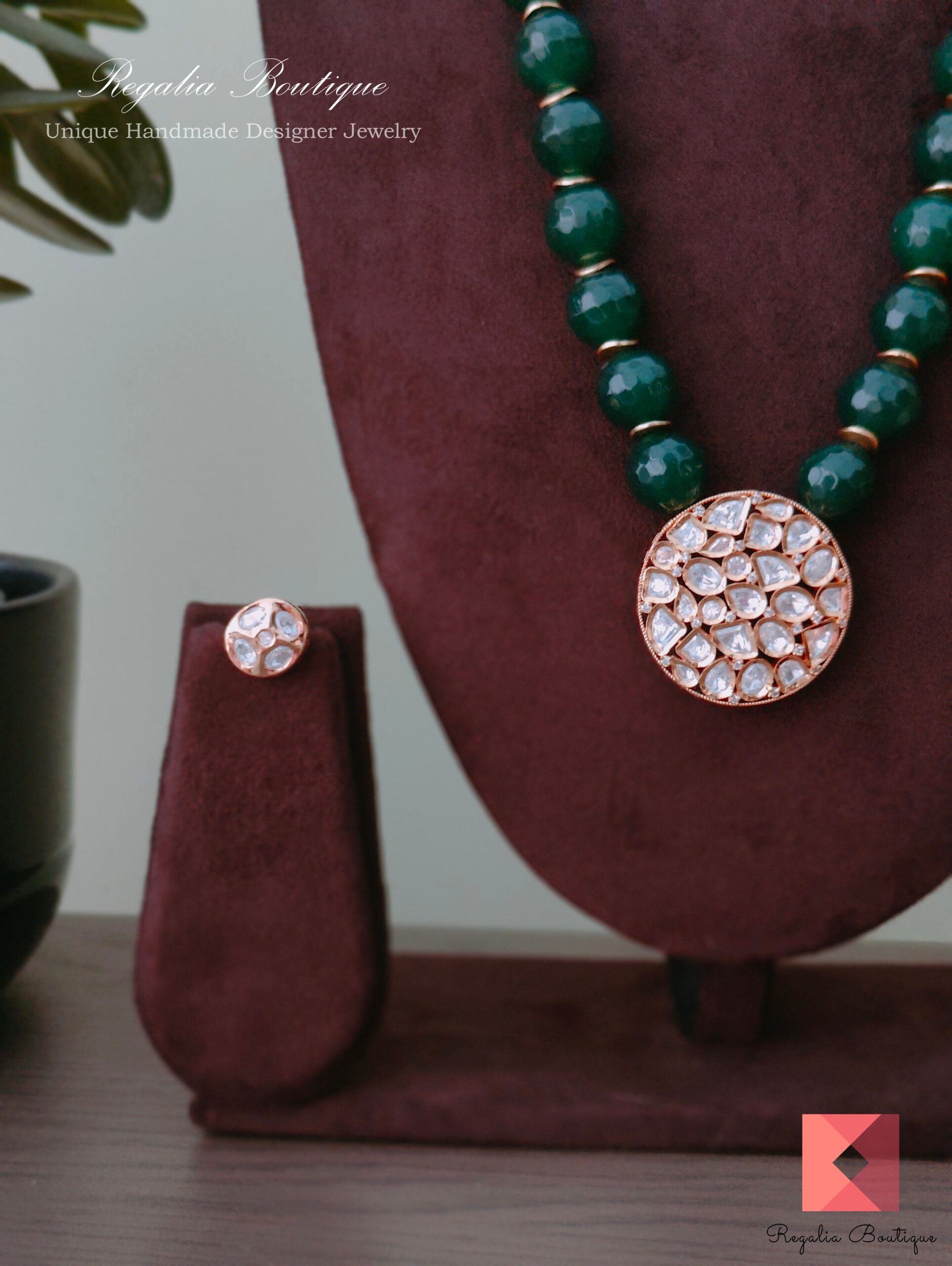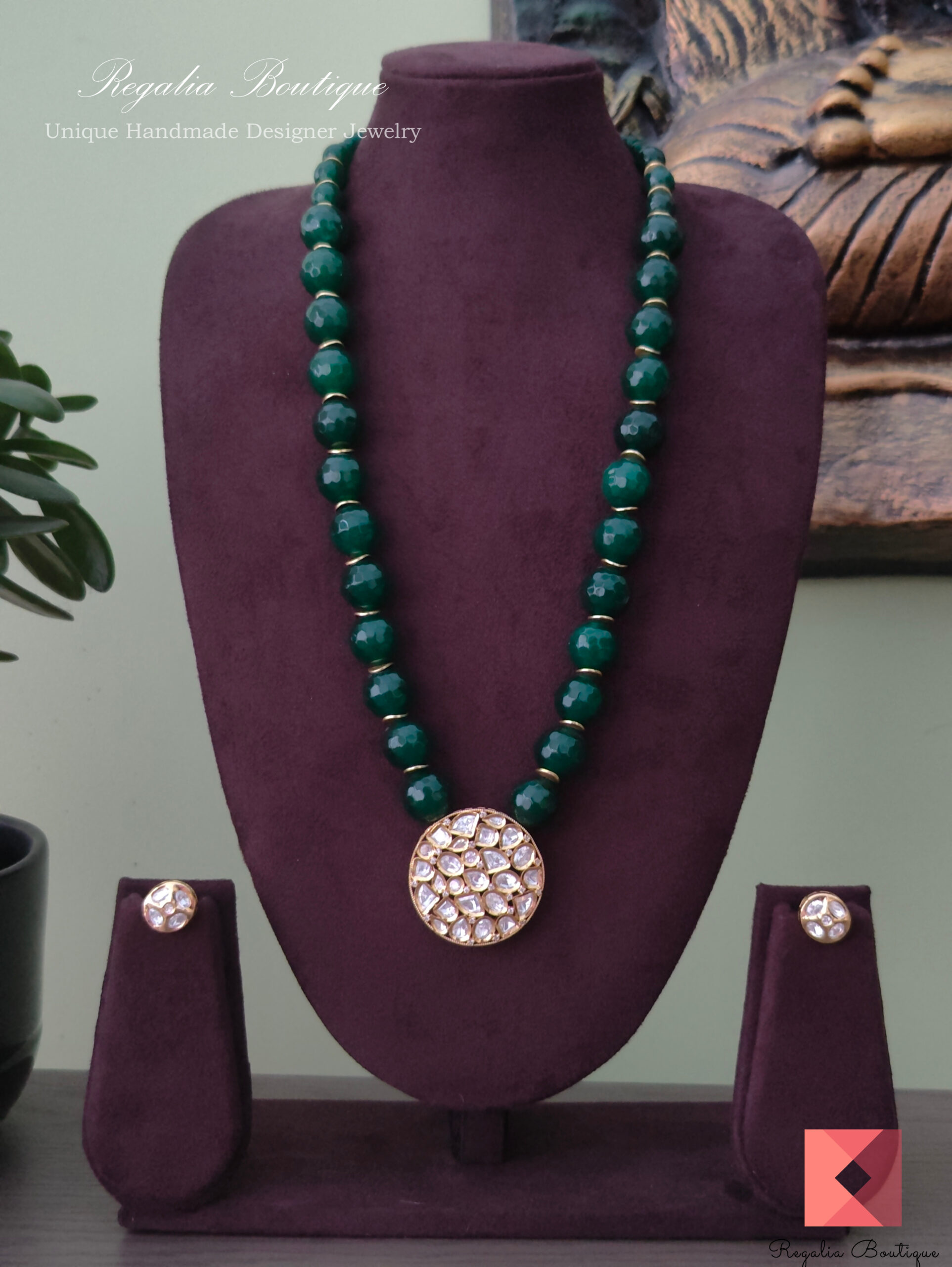 Kundan Pendant Pine-Green Semi-precious Bead Necklace Set!