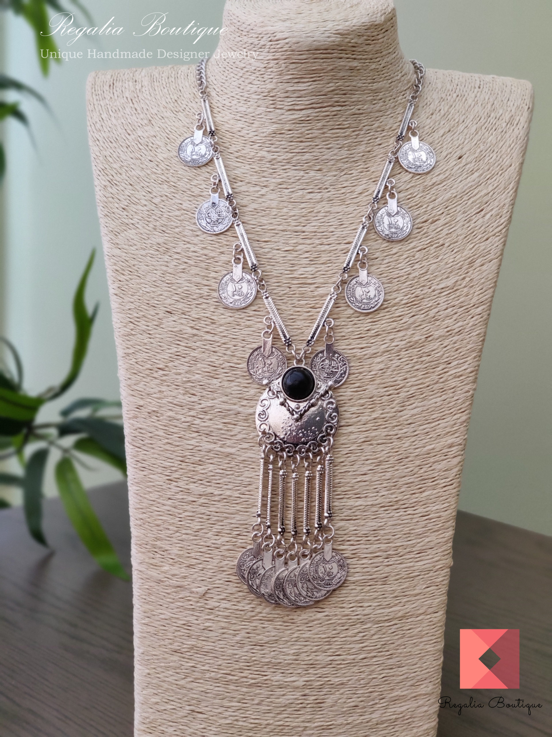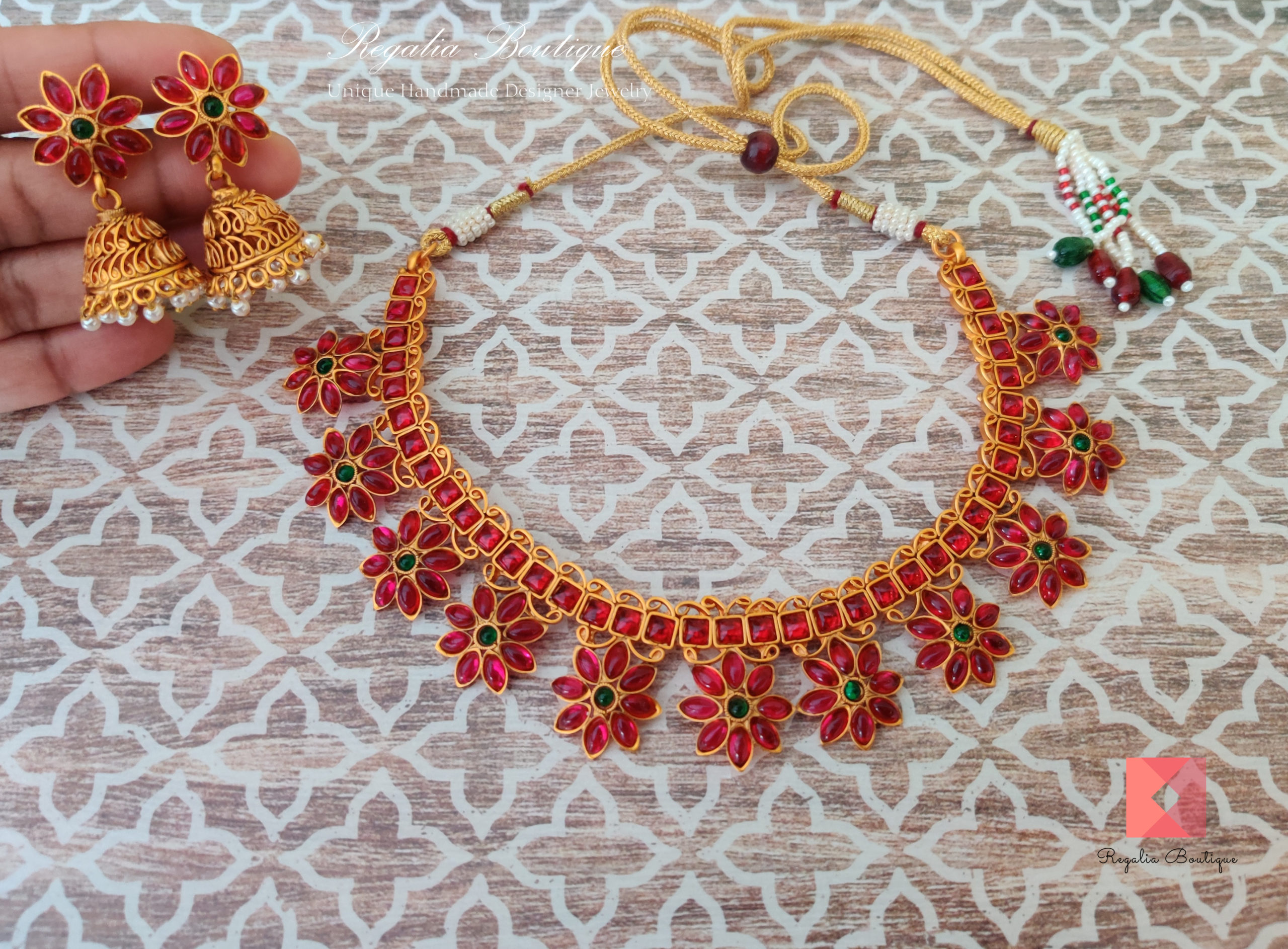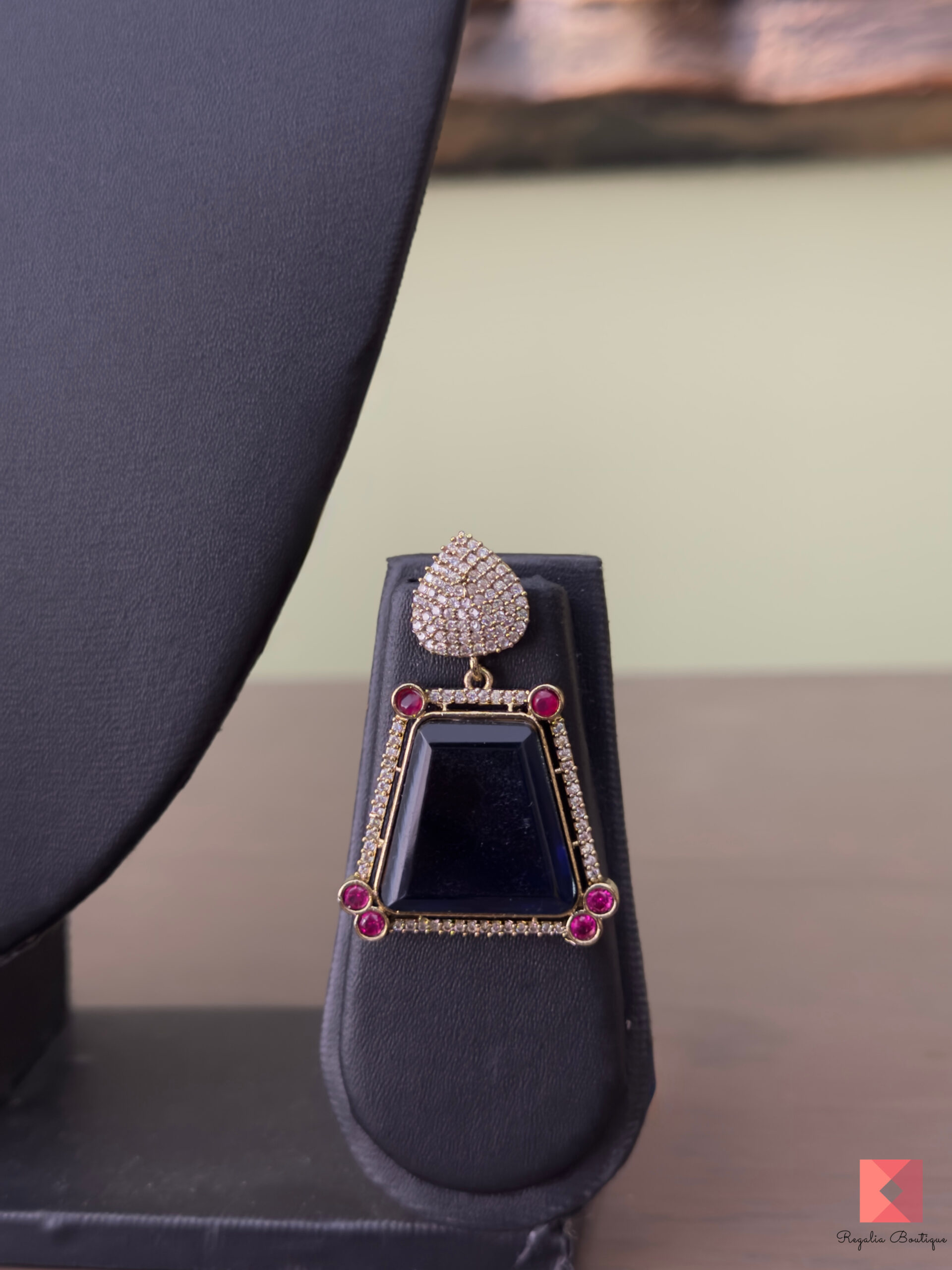 The structured design, enhanced by subtle ruby embellishments, adds a touch of luxury, making it an ideal choice for weddings, festive occasions, and statement wear. Paired with matching earrings that mirror the geometric elegance of the pendant, this set is a must-have for those who appreciate fine craftsmanship and sophisticated designs.