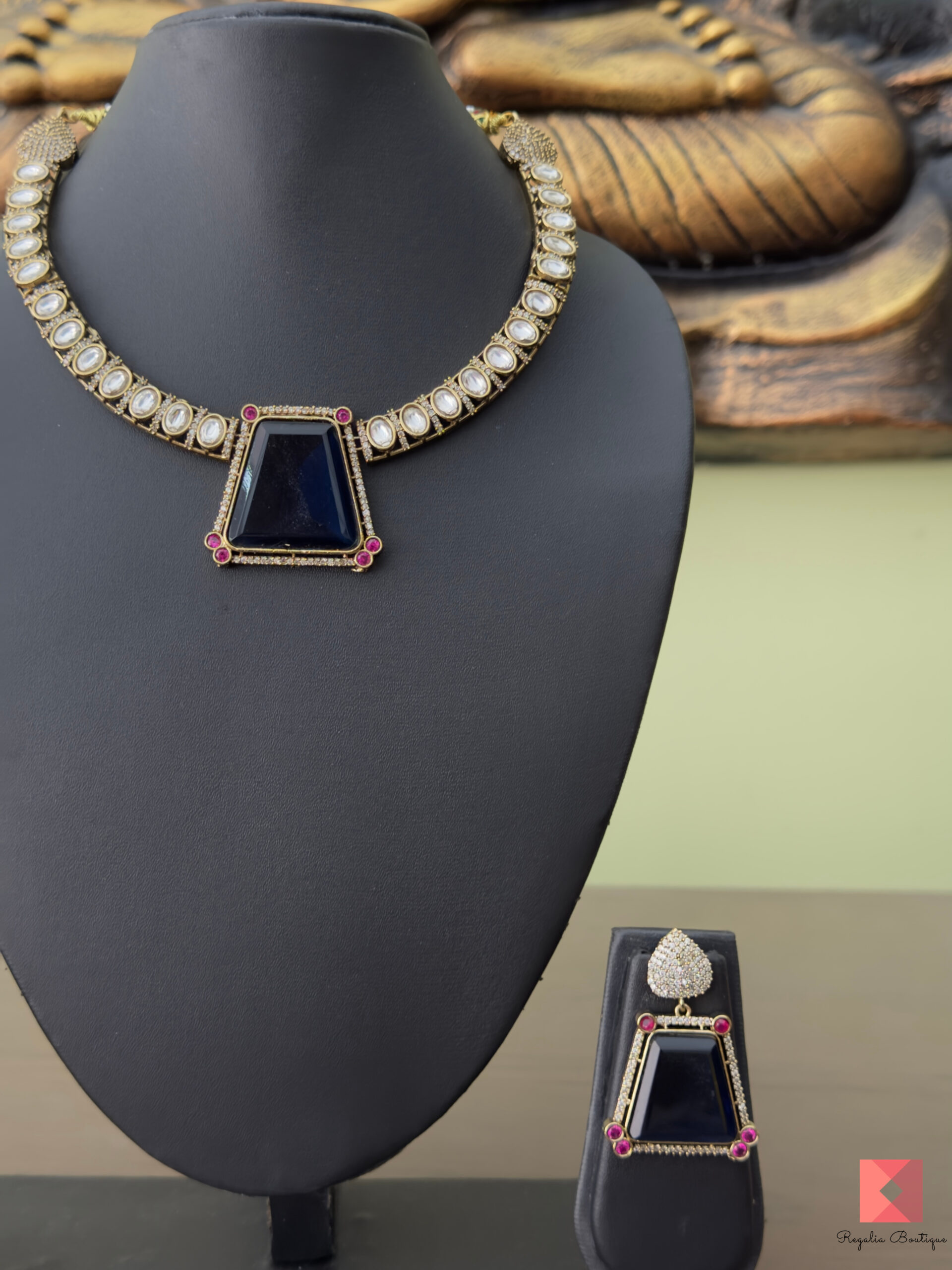 This exquisite necklace set is a perfect blend of elegance and grandeur, featuring a striking natural stone centerpiece framed with moissanite and AD (American Diamond) accents. The necklace is adorned with meticulously placed moissanite stones, creating a radiant and regal appeal.