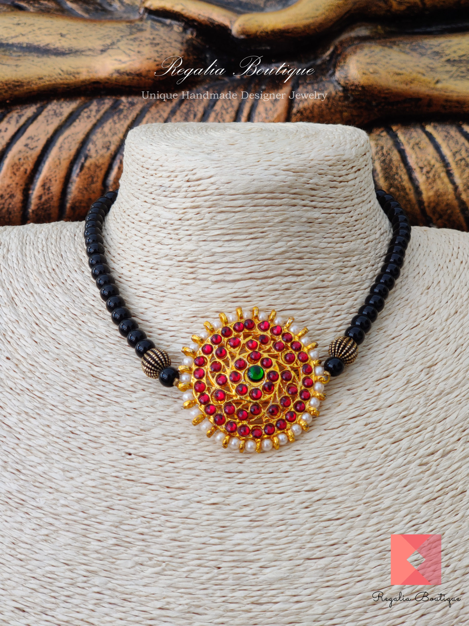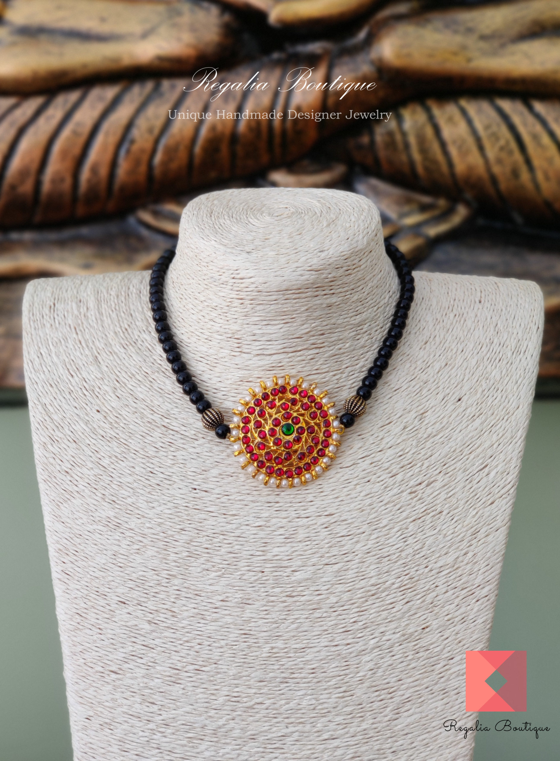 Add dollops of charm to your ethnic ensemble instantly with this charming kemp choker with black beads. Its enriched with onyx beads, kemp stones and pearls. Making it a perfect delight.