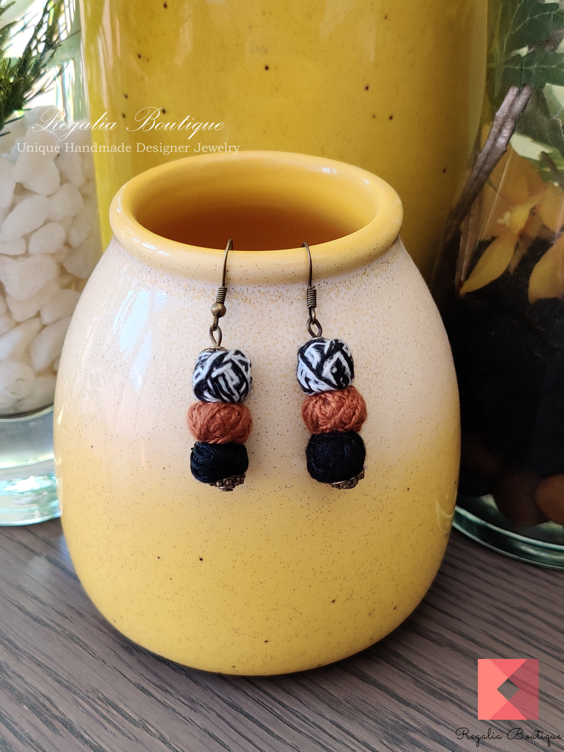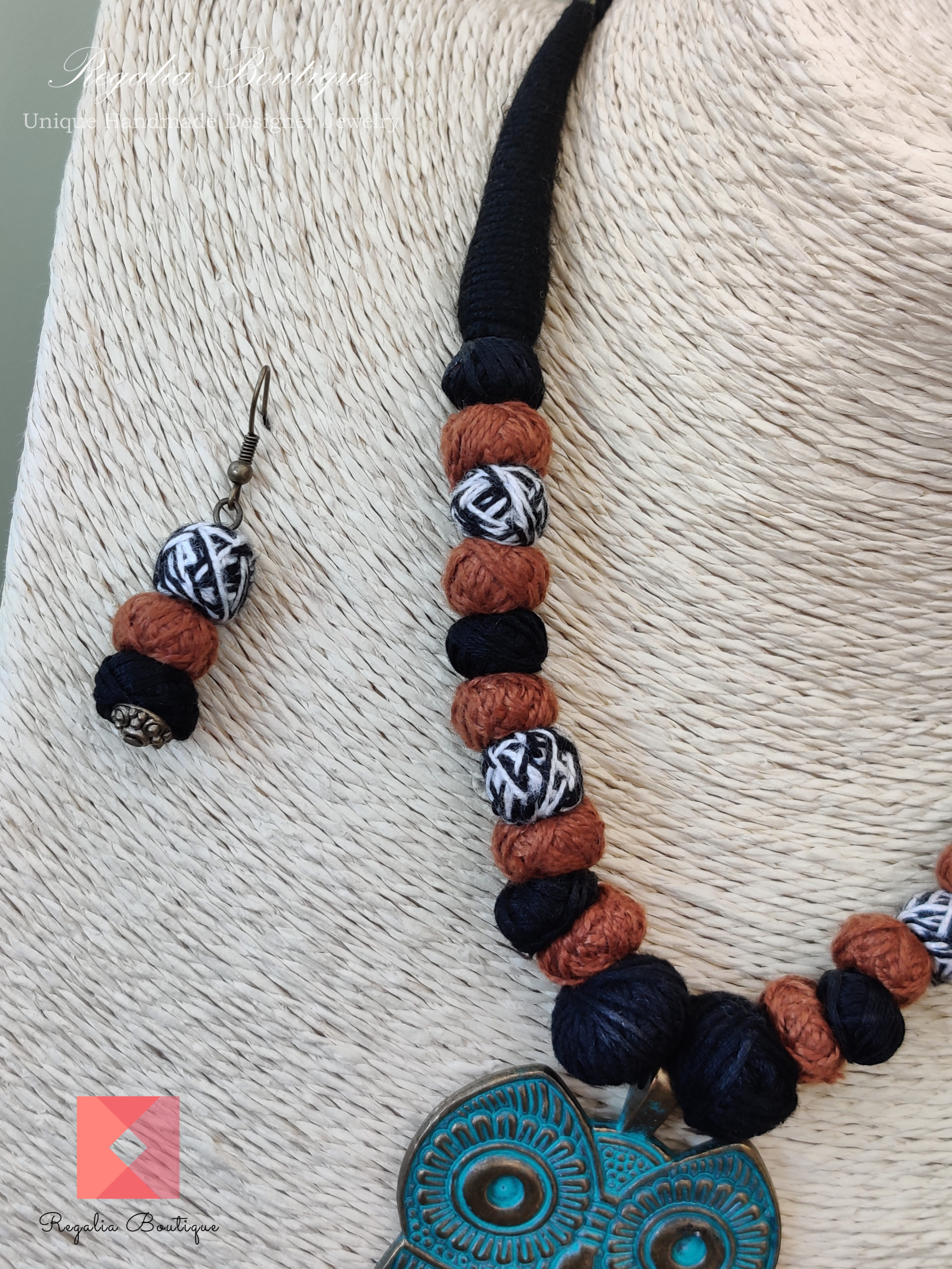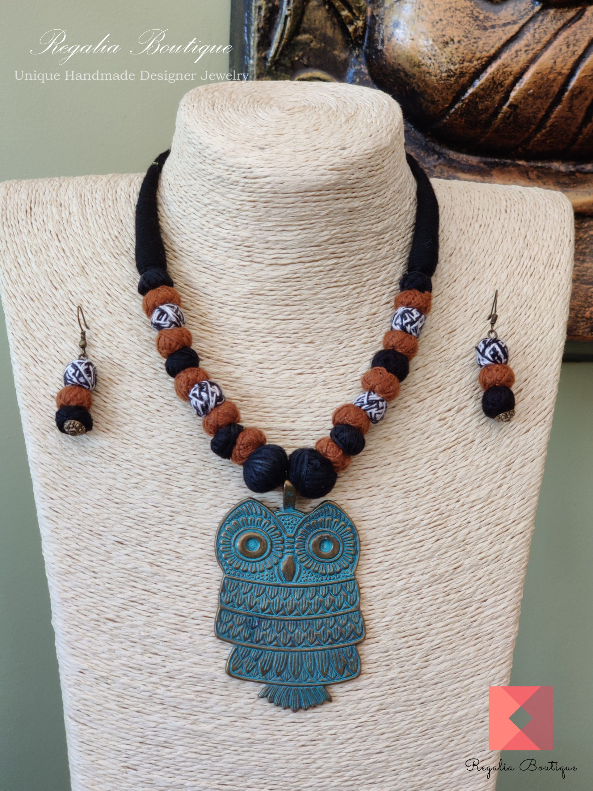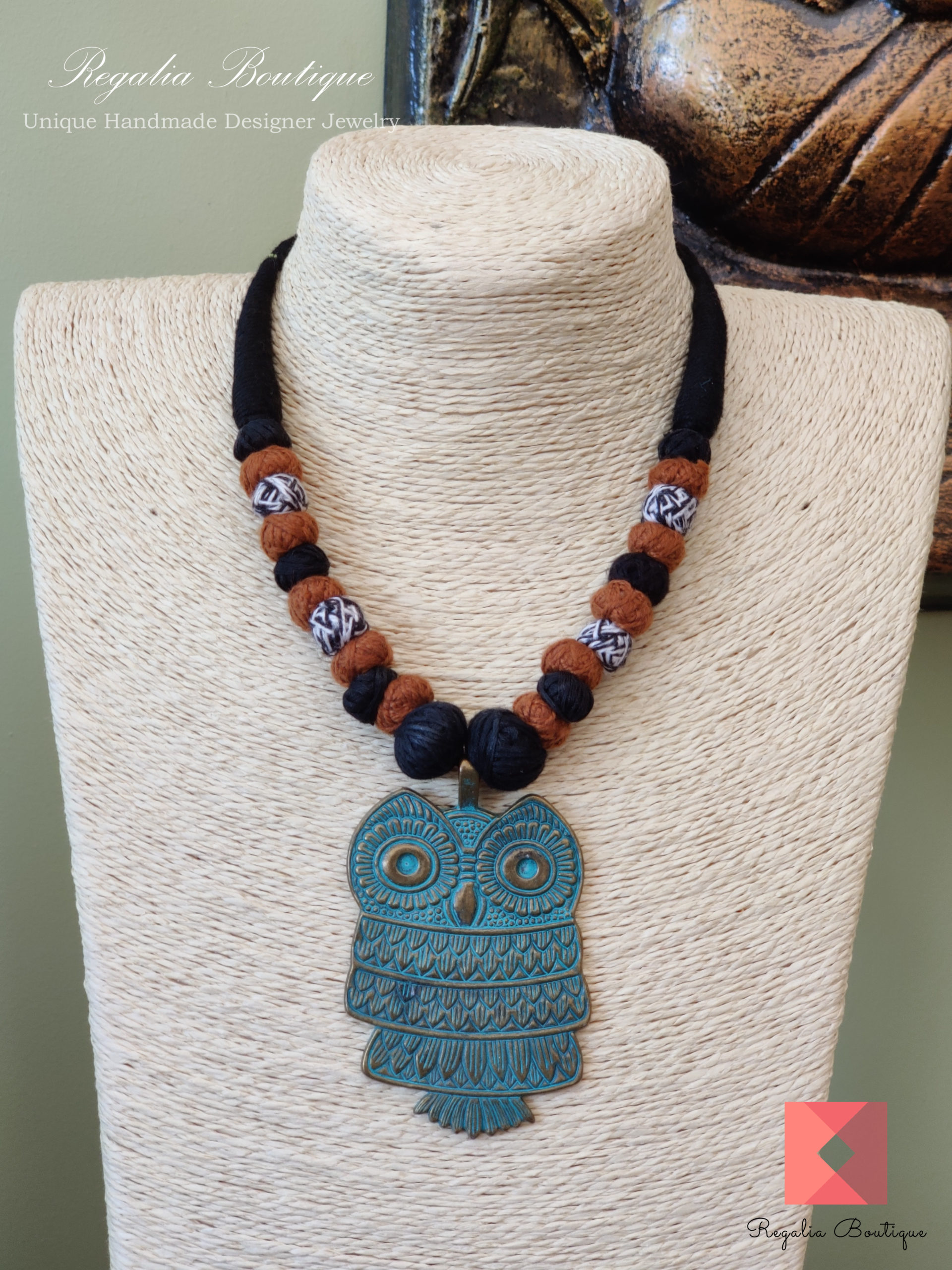 A modern thread necklace set with owl metal pendant.