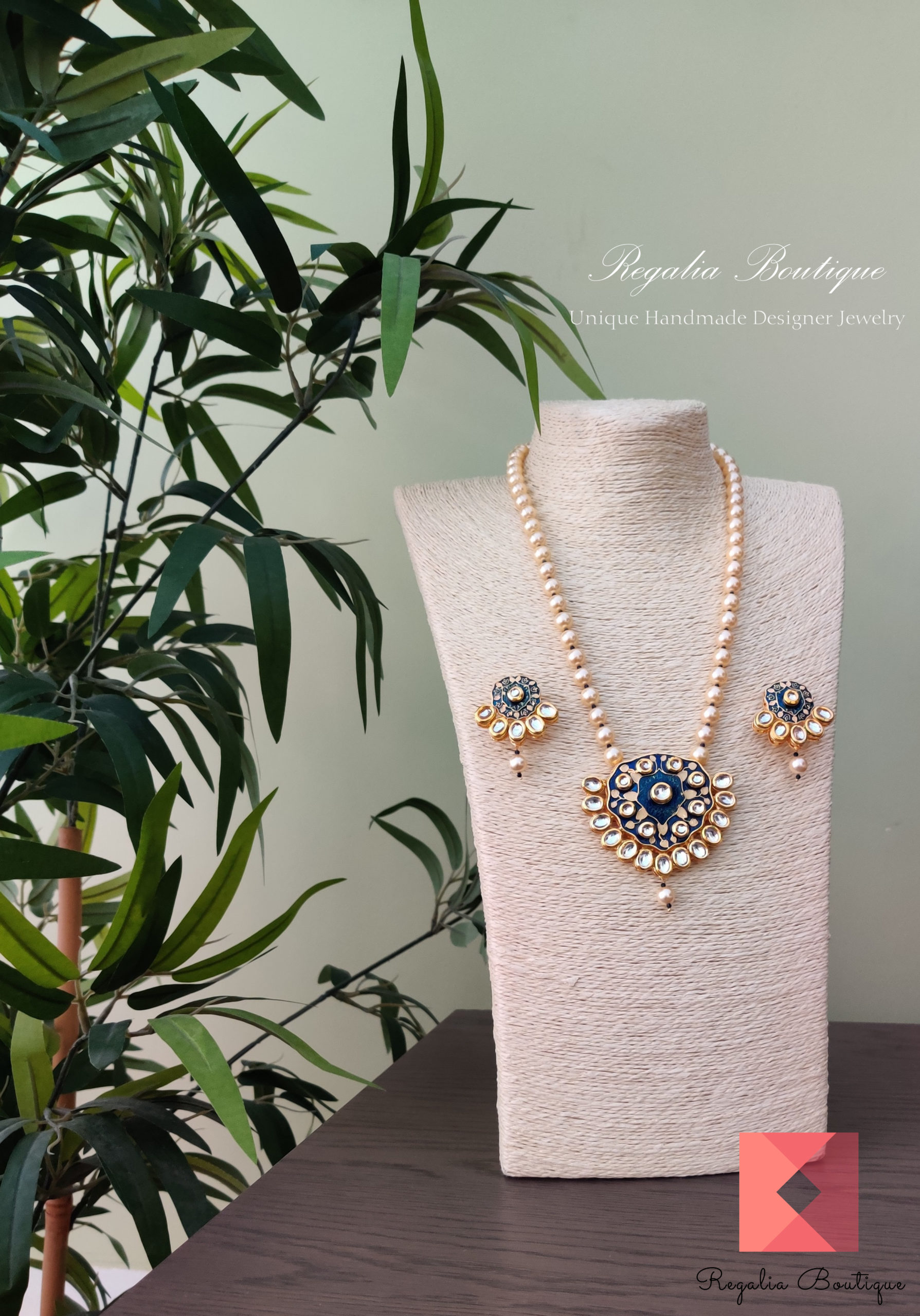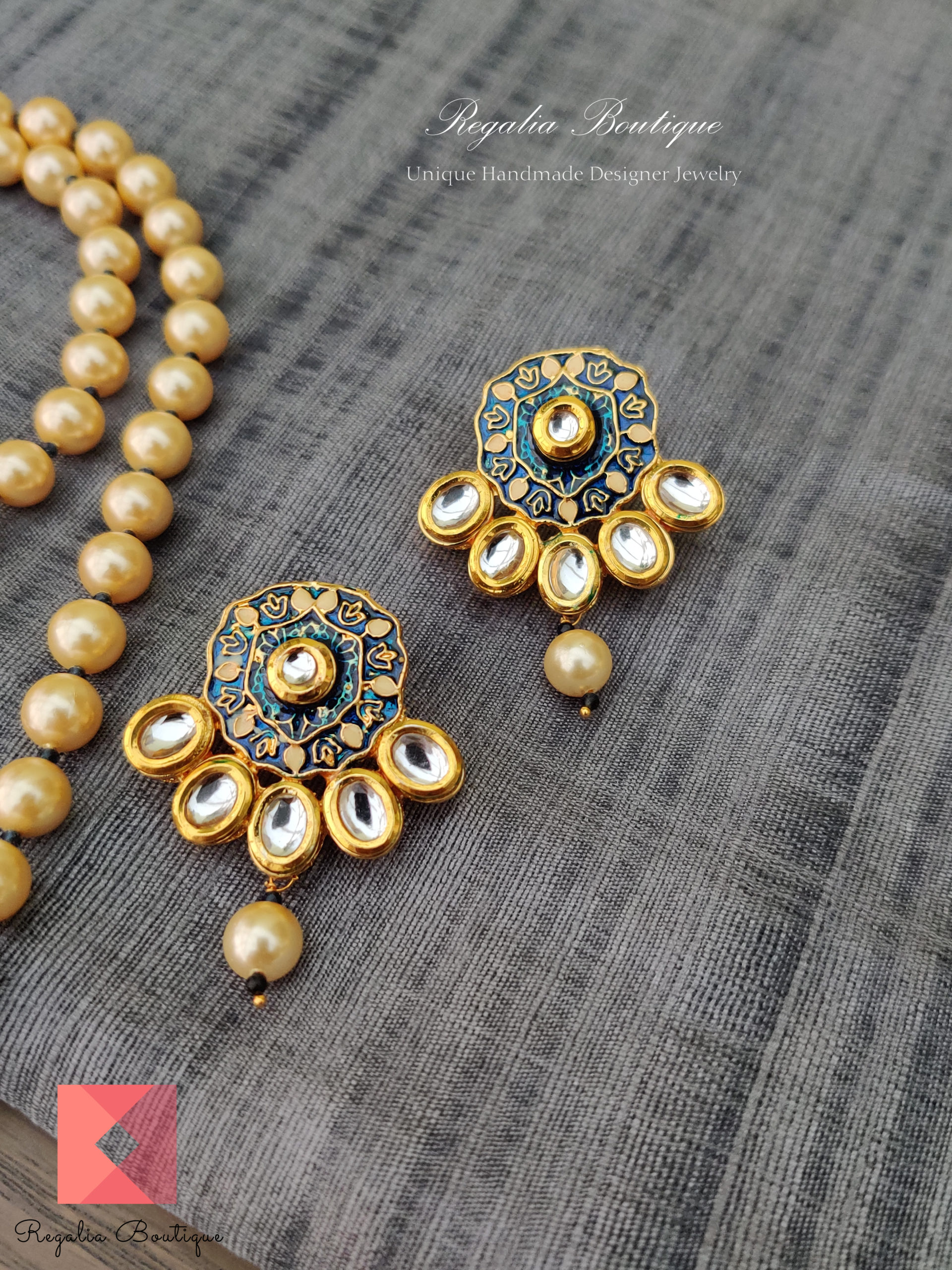 An adorable premium quality golden cream shell pearl necklace with an intricate design enamel art work and kundans making it exceptionally gorgeous.