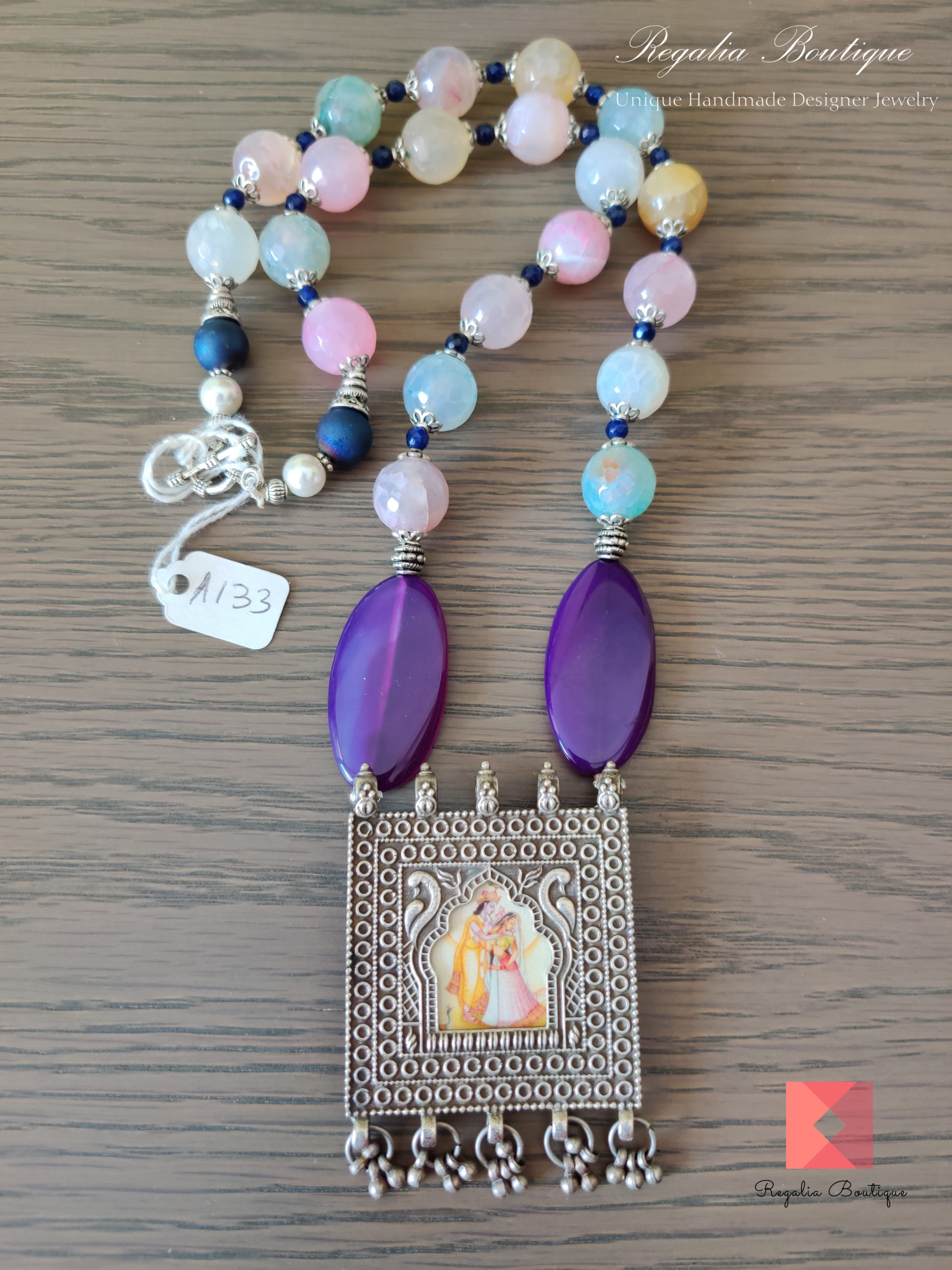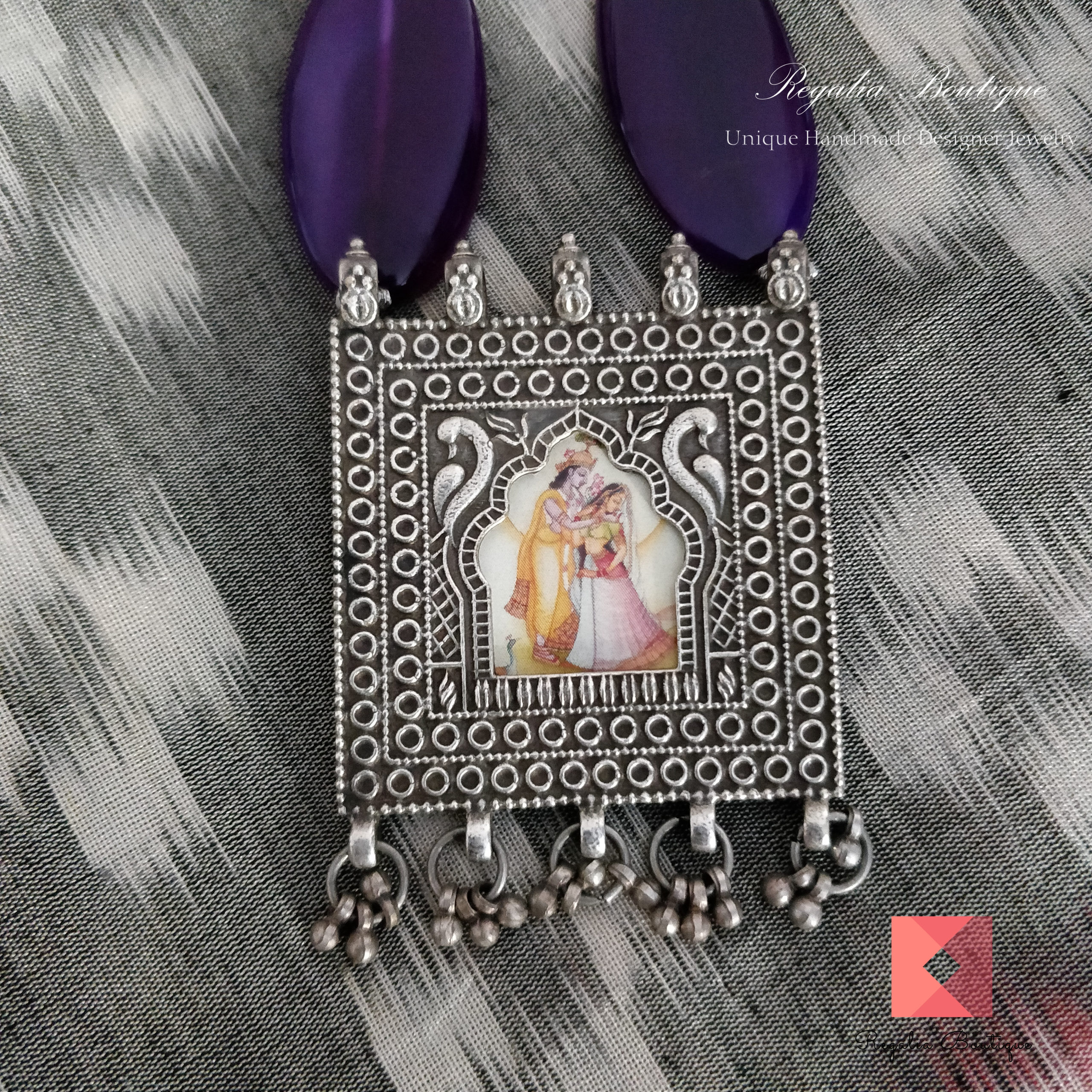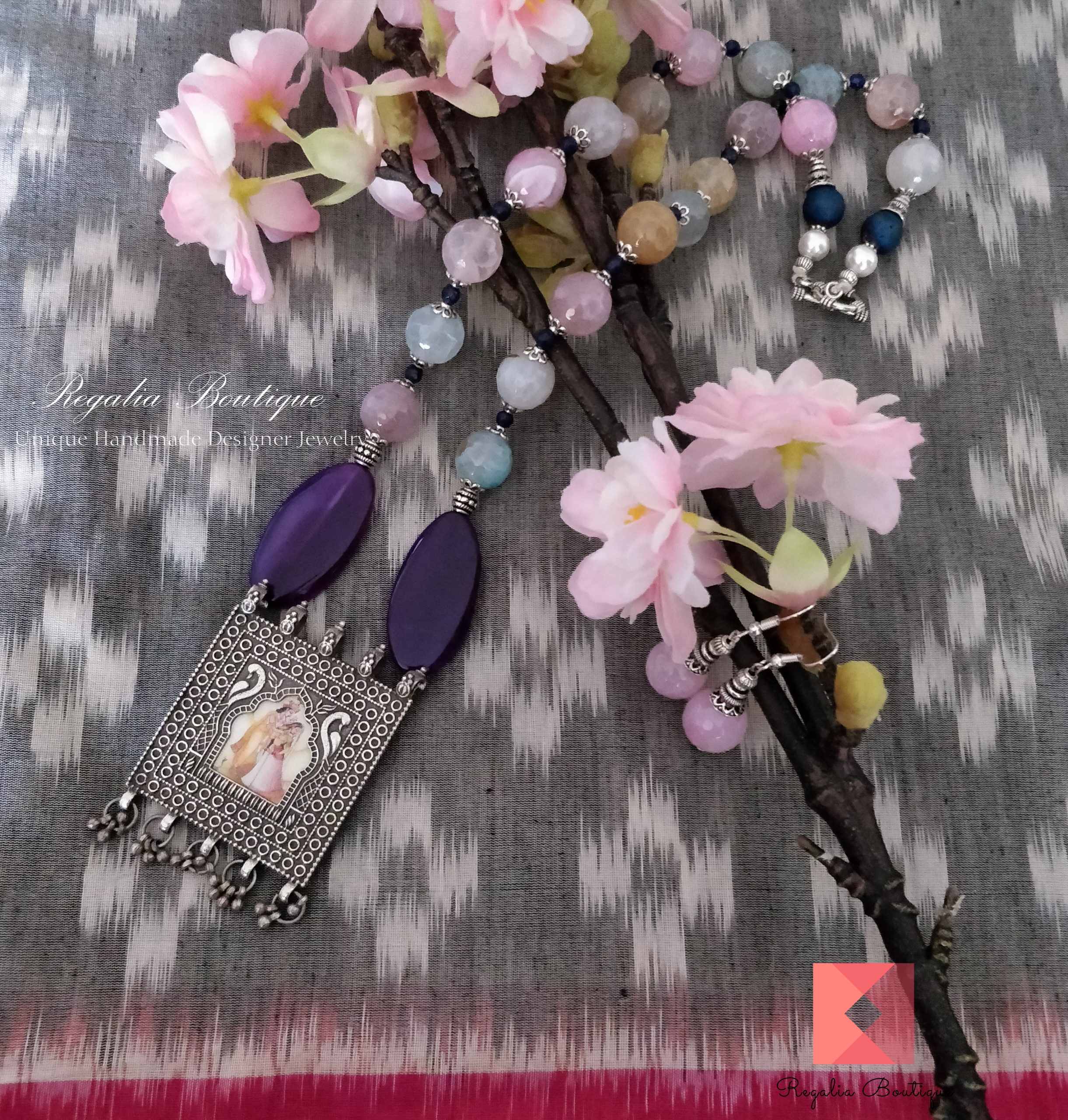 Oozing freshness of pastel shaded semi-precious beads, tied up with an artistic german silver pendant portraying Krishna Radha is at its best. Paired up with a matching dangler earrings.