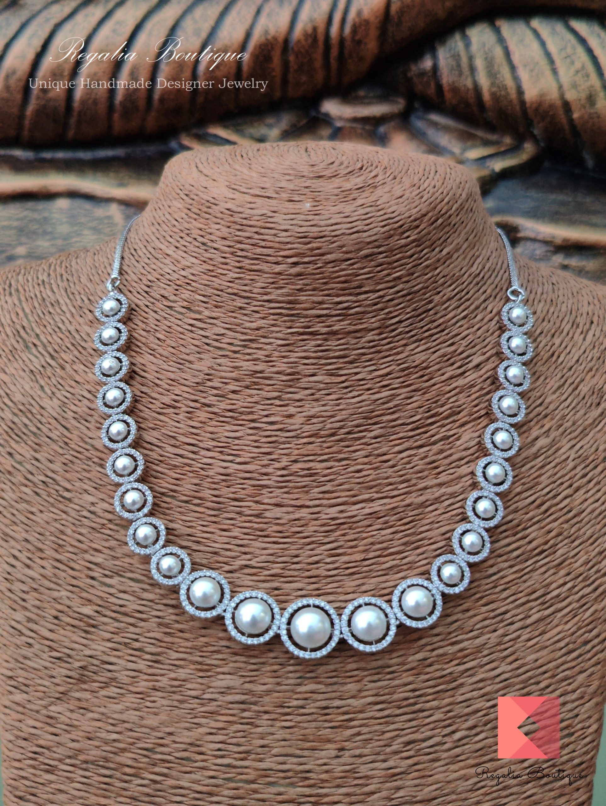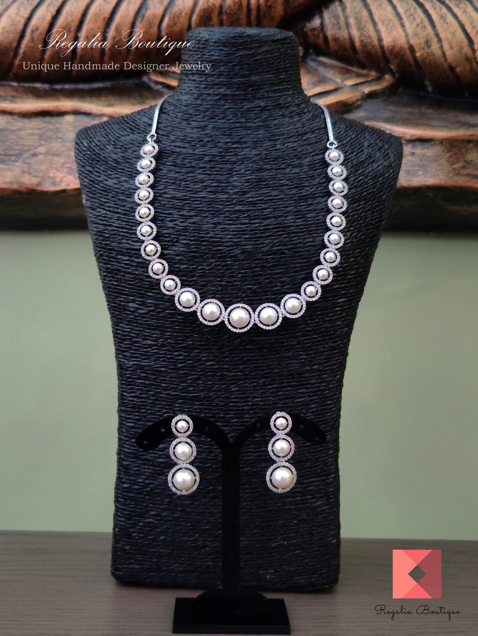 Rodium Finish Necklace Set embellished with cubic zircon stones & pearls.