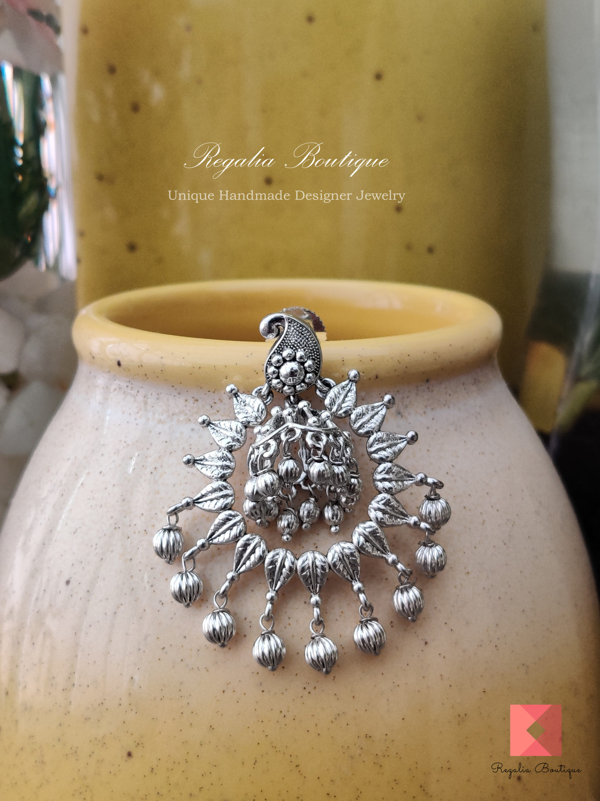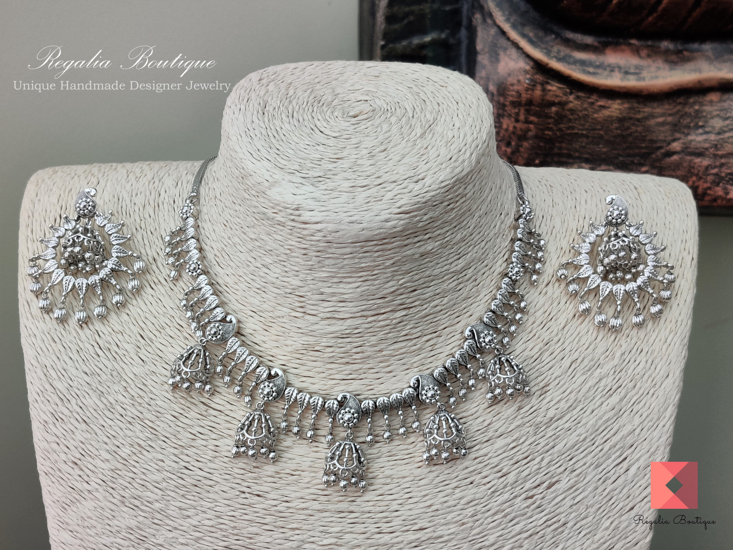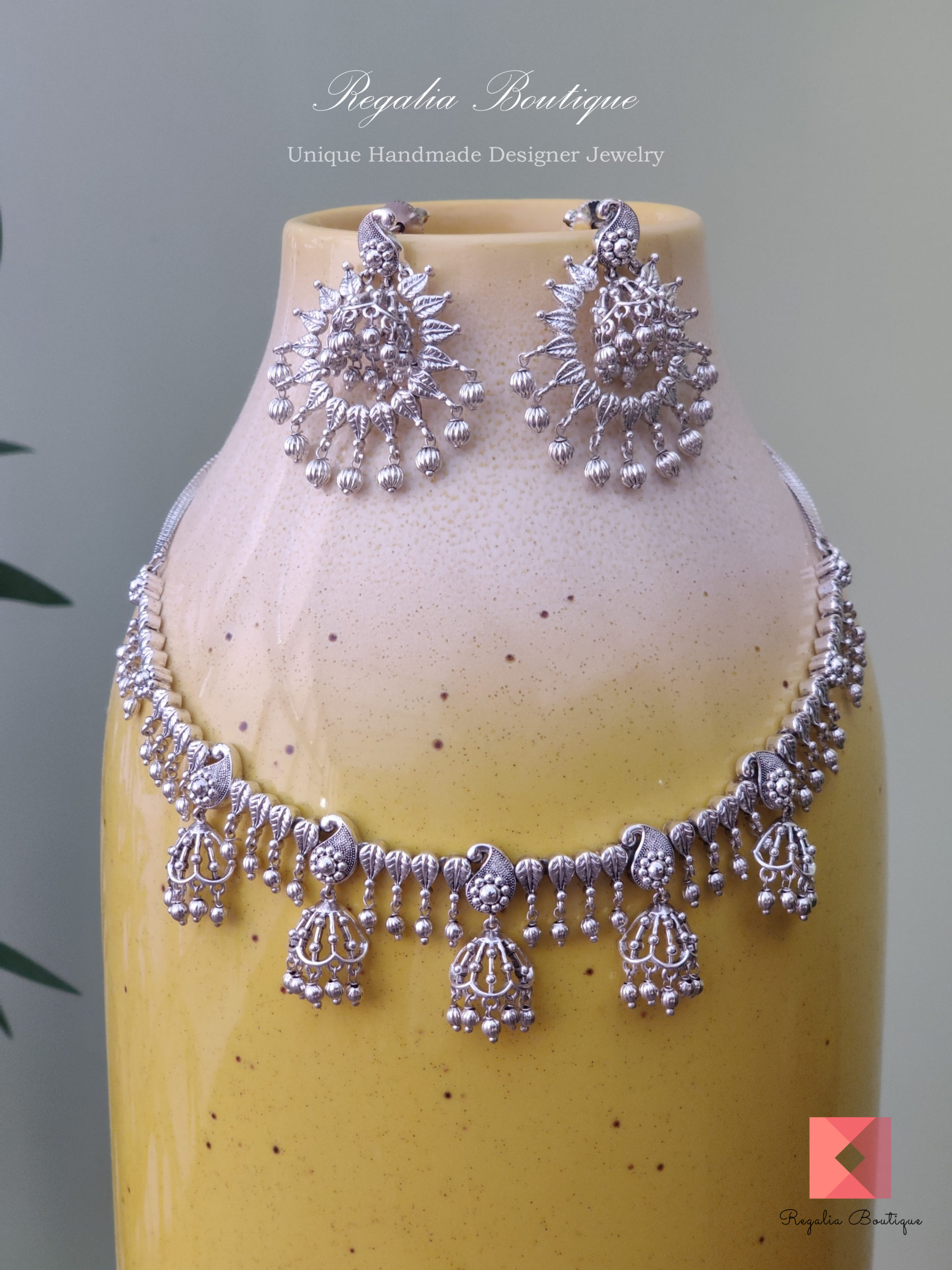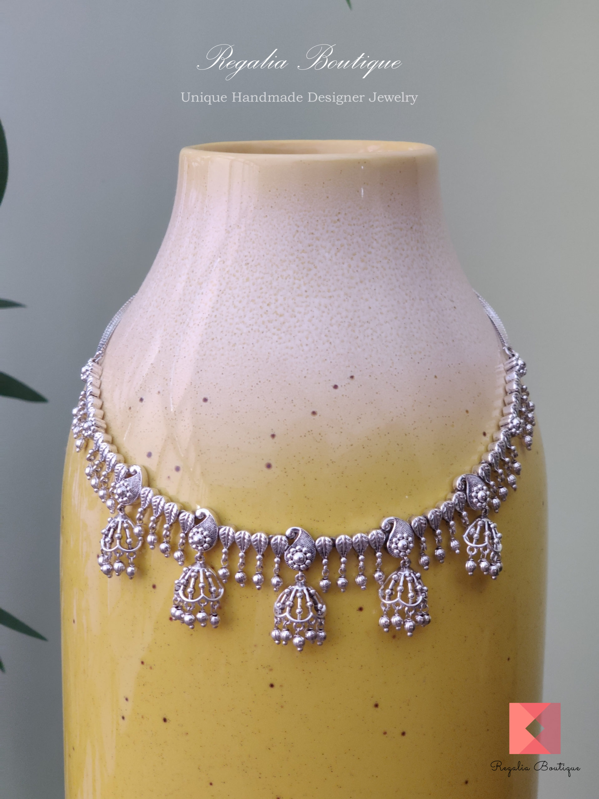 Make a bold statement with this beautiful jewel around your neck. It is crafted in brass metal and finished in antique silver plating to enhance its unique elegance. This stunning jewellery is designed with jhumki, motifs and sure you will impress the crowd with its charm.
