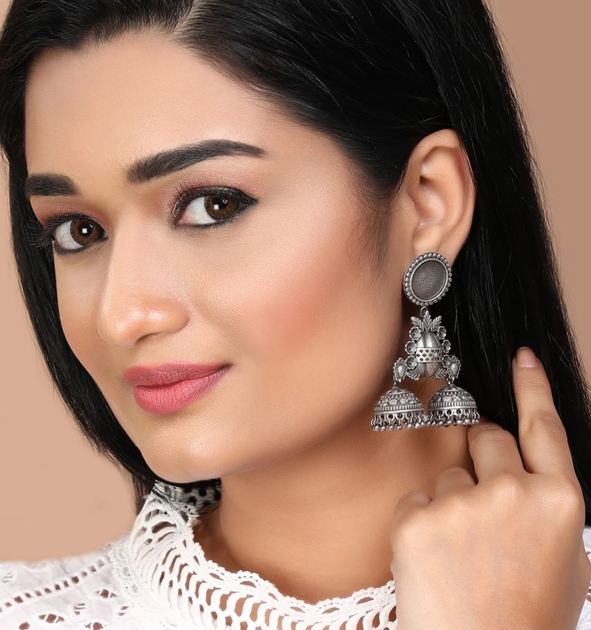 Silver look-alike jhumkas.