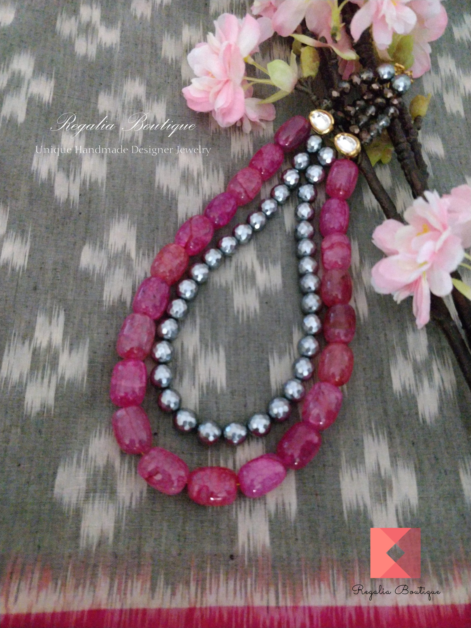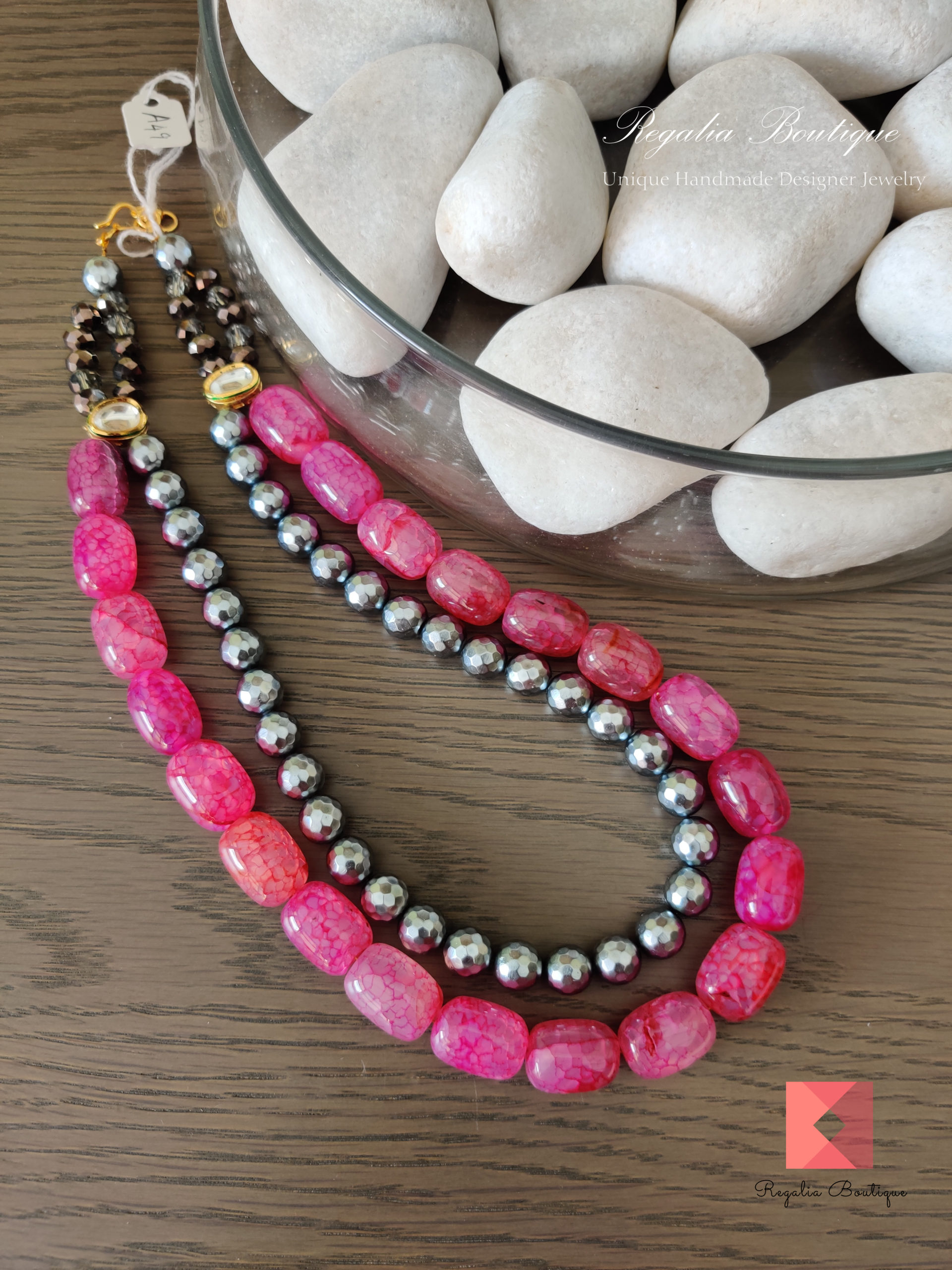 This bewitching and elegant designer statement necklace styled in dual layers comprising with semi-precious jade beads layer and glossy silver bead layer and embellished with high-quality kundans. Its one-of-a-kind head turner.