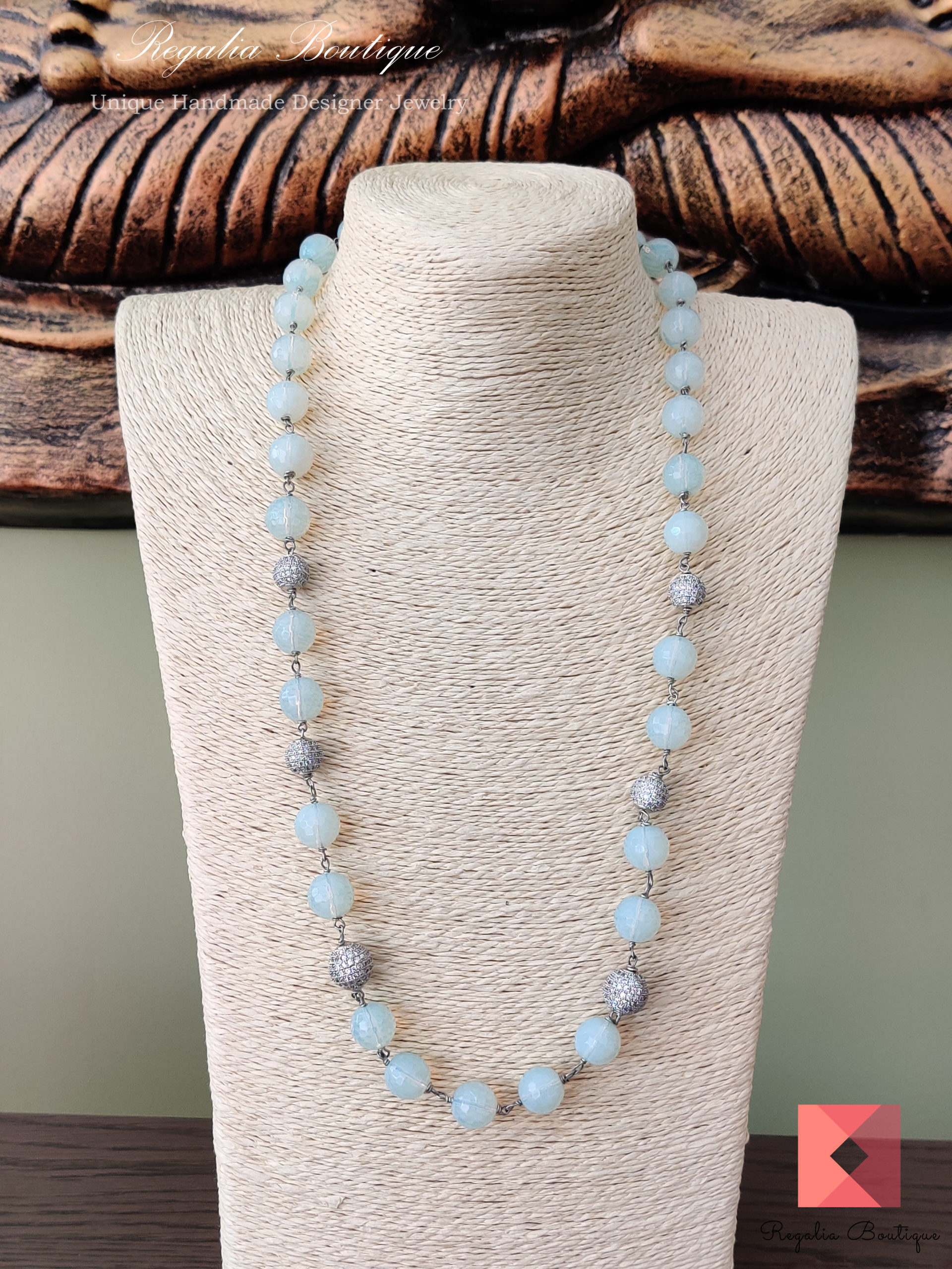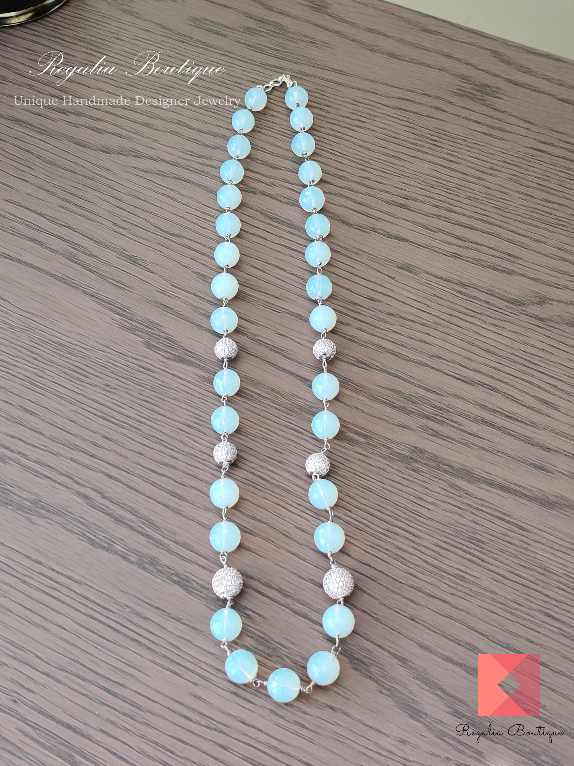 This unique and versatile, eye-catchy pale opaque blue semi-precious bead necklace is sweet and quirky one of a kind. Looks more of a transparent style. Lovingly hand-crafted with american beads.