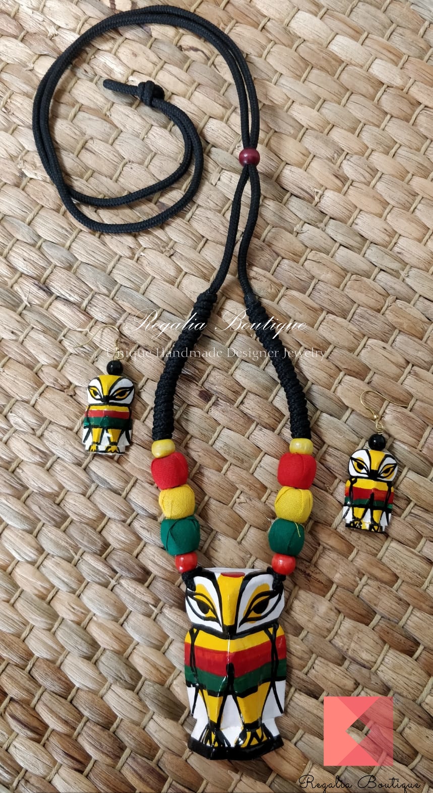 Bright and bold hand-crafted and painted wooden owl pendant necklace set with fabric balls and accomplished in a thread necklace.